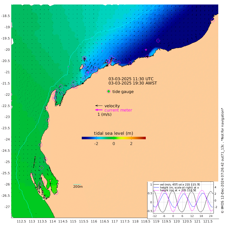 7cm/s 119T +12cm/s rms + 5cm/s -173T. NWSBAR 206m 2cm/s -137T +22cm/s rms + 10cm/s -148T. TAN100 109m 2cm/s -100T +11cm/s rms + 8cm/s -129T. PIL200 208m 5cm/s -122T +13cm/s rms + 7cm/s -137T. PIL100 105m 7cm/s -131T +12cm/s rms + 2cm/s -92T. PIL050 55m 1cm/s -147T +18cm/s rms + 4cm/s -149T. NRSNIN 61m 8cm/s -138T +6cm/s rms + 3cm/s 112T. NW Shelf M6 65m -37cm Withnell Point -18cm Denham -16cm Shark Bay (Inr Bn) -17cm Shark Bay 1cm Useless Loop 24cm Hamelin Pool -62cm Carnarvon -47cm Cape Cuvier -50cm Coral Bay -55cm Norwegian Bay -127cm Badjirrajirra -62cm Tantabiddi -94cm Point Murat -112cm Exmouth -133cm Learmonth -106cm Y Island -81cm North Muiron Island -98cm Roller -103cm Ashburton North -113cm Onslow (Beadon Creek) -107cm Thevenard Island -148cm Large Island -203cm North Sandy Island -152cm Barrow Island (Wapet Landing) -197cm Barrow Island (Tanker Mooring) -213cm Withnell Bay -151cm Trimouille Island -123cm North West Island -164cm Fortescue Road -212cm Steamboat Island -211cm Sholl Island -209cm Fairway Beacon -213cm Mawby Island -212cm Dampier (King Bay) -215cm Cape Legendre -234cm Hauy Island -265cm Port Walcott (Cape Lambert) -294cm Depuch Island -326cm Port Hedland -296cm Bedout Island -344cm Lagrange Bay