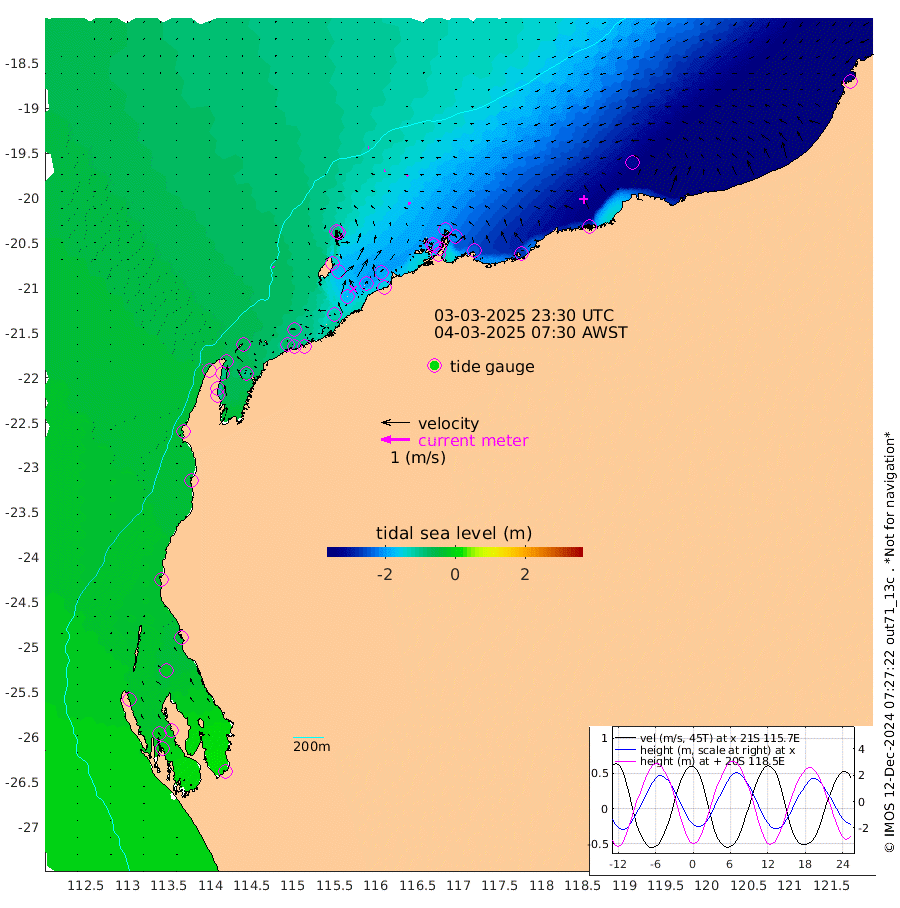 4cm/s 144T +12cm/s rms + 5cm/s -173T. NWSBAR 206m 2cm/s -138T +22cm/s rms + 10cm/s -148T. TAN100 109m 3cm/s -70T +11cm/s rms + 8cm/s -129T. PIL200 208m 4cm/s -99T +13cm/s rms + 7cm/s -137T. PIL100 105m 7cm/s -101T +12cm/s rms + 2cm/s -92T. PIL050 55m 1cm/s -158T +18cm/s rms + 4cm/s -149T. NRSNIN 61m 6cm/s -139T +6cm/s rms + 3cm/s 112T. NW Shelf M6 65m -20cm Withnell Point -14cm Denham -12cm Shark Bay (Inr Bn) -15cm Shark Bay -7cm Useless Loop 8cm Hamelin Pool -42cm Carnarvon -30cm Cape Cuvier -34cm Coral Bay -38cm Norwegian Bay -108cm Badjirrajirra -46cm Tantabiddi -76cm Point Murat -93cm Exmouth -105cm Learmonth -91cm Y Island -64cm North Muiron Island -78cm Roller -87cm Ashburton North -96cm Onslow (Beadon Creek) -90cm Thevenard Island -118cm Large Island -177cm North Sandy Island -132cm Barrow Island (Wapet Landing) -173cm Barrow Island (Tanker Mooring) -192cm Withnell Bay -127cm Trimouille Island -101cm North West Island -147cm Fortescue Road -188cm Steamboat Island -192cm Sholl Island -187cm Fairway Beacon -189cm Mawby Island -192cm Dampier (King Bay) -190cm Cape Legendre -210cm Hauy Island -243cm Port Walcott (Cape Lambert) -263cm Depuch Island -303cm Port Hedland -307cm Bedout Island -316cm Lagrange Bay