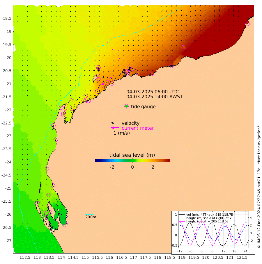 7cm/s -75T +12cm/s rms + 5cm/s -173T. NWSBAR 206m 0cm/s 23T +22cm/s rms + 10cm/s -148T. TAN100 109m 2cm/s -38T +11cm/s rms + 8cm/s -129T. PIL200 208m 6cm/s -1T +13cm/s rms + 7cm/s -137T. PIL100 105m 9cm/s 9T +12cm/s rms + 2cm/s -92T. PIL050 55m 1cm/s -26T +18cm/s rms + 4cm/s -149T. NRSNIN 61m 9cm/s 18T +6cm/s rms + 3cm/s 112T. NW Shelf M6 65m 43cm Withnell Point 37cm Denham 35cm Shark Bay (Inr Bn) 35cm Shark Bay 24cm Useless Loop -16cm Hamelin Pool 66cm Carnarvon 48cm Cape Cuvier 51cm Coral Bay 56cm Norwegian Bay 131cm Badjirrajirra 62cm Tantabiddi 96cm Point Murat 116cm Exmouth 131cm Learmonth 110cm Y Island 82cm North Muiron Island 96cm Roller 103cm Ashburton North 115cm Onslow (Beadon Creek) 107cm Thevenard Island 152cm Large Island 202cm North Sandy Island 152cm Barrow Island (Wapet Landing) 198cm Barrow Island (Tanker Mooring) 207cm Withnell Bay 150cm Trimouille Island 120cm North West Island 172cm Fortescue Road 208cm Steamboat Island 208cm Sholl Island 204cm Fairway Beacon 205cm Mawby Island 207cm Dampier (King Bay) 210cm Cape Legendre 228cm Hauy Island 259cm Port Walcott (Cape Lambert) 285cm Depuch Island 317cm Port Hedland 298cm Bedout Island 325cm Lagrange Bay