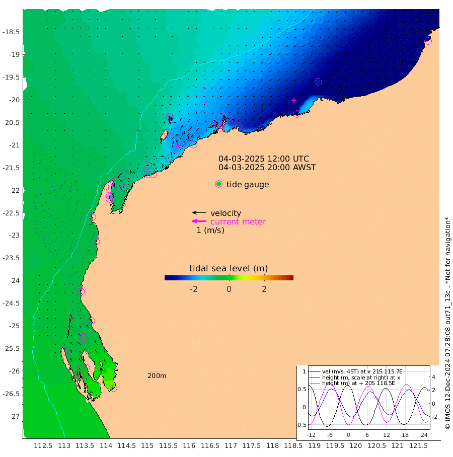 6cm/s 125T +12cm/s rms + 5cm/s -173T. NWSBAR 206m 3cm/s -136T +22cm/s rms + 10cm/s -148T. TAN100 109m 3cm/s -92T +11cm/s rms + 8cm/s -129T. PIL200 208m 5cm/s -105T +13cm/s rms + 7cm/s -137T. PIL100 105m 7cm/s -116T +12cm/s rms + 2cm/s -92T. PIL050 55m 3cm/s -140T +18cm/s rms + 4cm/s -149T. NRSNIN 61m 8cm/s -121T +6cm/s rms + 3cm/s 112T. NW Shelf M6 65m -37cm Withnell Point -14cm Denham -12cm Shark Bay (Inr Bn) -14cm Shark Bay 6cm Useless Loop 26cm Hamelin Pool -63cm Carnarvon -51cm Cape Cuvier -53cm Coral Bay -58cm Norwegian Bay -125cm Badjirrajirra -64cm Tantabiddi -93cm Point Murat -111cm Exmouth -131cm Learmonth -105cm Y Island -81cm North Muiron Island -98cm Roller -103cm Ashburton North -112cm Onslow (Beadon Creek) -107cm Thevenard Island -141cm Large Island -197cm North Sandy Island -149cm Barrow Island (Wapet Landing) -190cm Barrow Island (Tanker Mooring) -206cm Withnell Bay -147cm Trimouille Island -121cm North West Island -155cm Fortescue Road -204cm Steamboat Island -208cm Sholl Island -202cm Fairway Beacon -207cm Mawby Island -206cm Dampier (King Bay) -209cm Cape Legendre -225cm Hauy Island -255cm Port Walcott (Cape Lambert) -277cm Depuch Island -312cm Port Hedland -282cm Bedout Island -319cm Lagrange Bay
