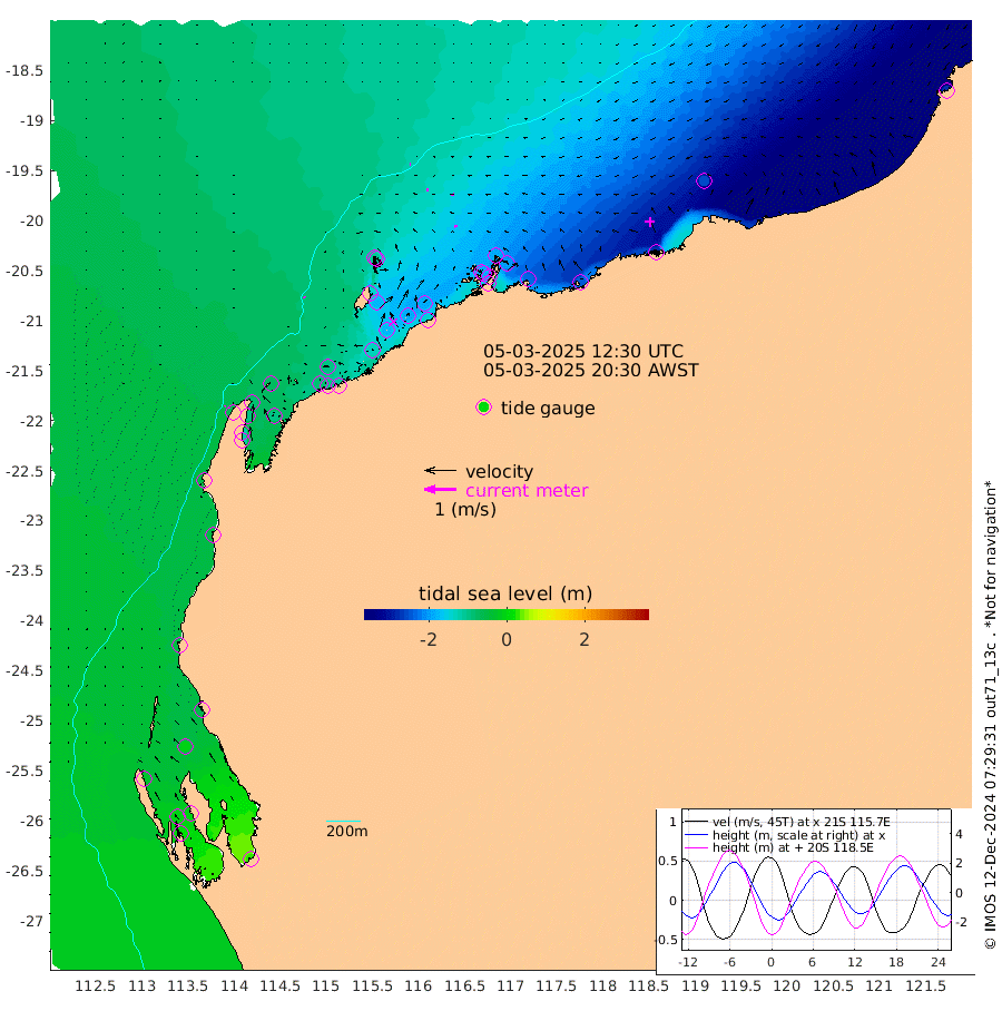 5cm/s 132T +12cm/s rms + 5cm/s -173T. NWSBAR 206m 4cm/s -135T +22cm/s rms + 10cm/s -148T. TAN100 109m 4cm/s -86T +11cm/s rms + 8cm/s -129T. PIL200 208m 6cm/s -89T +13cm/s rms + 7cm/s -137T. PIL100 105m 8cm/s -99T +12cm/s rms + 2cm/s -92T. PIL050 55m 4cm/s -137T +18cm/s rms + 4cm/s -149T. NRSNIN 61m 8cm/s -100T +6cm/s rms + 3cm/s 112T. NW Shelf M6 65m -32cm Withnell Point -7cm Denham -5cm Shark Bay (Inr Bn) -8cm Shark Bay 13cm Useless Loop 27cm Hamelin Pool -59cm Carnarvon -49cm Cape Cuvier -52cm Coral Bay -56cm Norwegian Bay -114cm Badjirrajirra -60cm Tantabiddi -86cm Point Murat -101cm Exmouth -119cm Learmonth -96cm Y Island -75cm North Muiron Island -90cm Roller -95cm Ashburton North -103cm Onslow (Beadon Creek) -98cm Thevenard Island -127cm Large Island -178cm North Sandy Island -135cm Barrow Island (Wapet Landing) -170cm Barrow Island (Tanker Mooring) -185cm Withnell Bay -133cm Trimouille Island -109cm North West Island -138cm Fortescue Road -182cm Steamboat Island -191cm Sholl Island -182cm Fairway Beacon -186cm Mawby Island -185cm Dampier (King Bay) -189cm Cape Legendre -201cm Hauy Island -228cm Port Walcott (Cape Lambert) -241cm Depuch Island -278cm Port Hedland -250cm Bedout Island -281cm Lagrange Bay