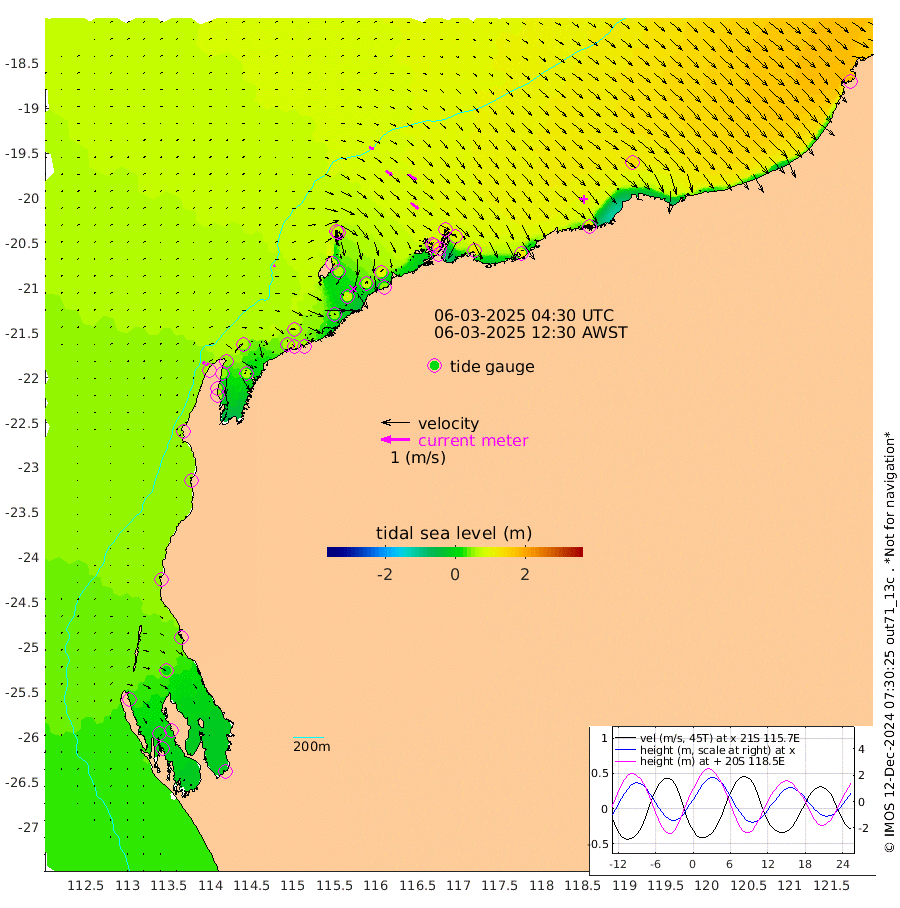 7cm/s 67T +12cm/s rms + 5cm/s -173T. NWSBAR 206m 11cm/s 40T +22cm/s rms + 10cm/s -148T. TAN100 109m 17cm/s 108T +11cm/s rms + 8cm/s -129T. PIL200 208m 29cm/s 124T +13cm/s rms + 7cm/s -137T. PIL100 105m 34cm/s 126T +12cm/s rms + 2cm/s -92T. PIL050 55m 11cm/s 47T +18cm/s rms + 4cm/s -149T. NRSNIN 61m 35cm/s 121T +6cm/s rms + 3cm/s 112T. NW Shelf M6 65m 27cm Withnell Point 9cm Denham 10cm Shark Bay (Inr Bn) 11cm Shark Bay 2cm Useless Loop -12cm Hamelin Pool 44cm Carnarvon 52cm Cape Cuvier 55cm Coral Bay 52cm Norwegian Bay 55cm Badjirrajirra 57cm Tantabiddi 53cm Point Murat 53cm Exmouth 58cm Learmonth 61cm Y Island 60cm North Muiron Island 65cm Roller 68cm Ashburton North 67cm Onslow (Beadon Creek) 69cm Thevenard Island 53cm Large Island 71cm North Sandy Island 74cm Barrow Island (Wapet Landing) 61cm Barrow Island (Tanker Mooring) 105cm Withnell Bay 70cm Trimouille Island 74cm North West Island 50cm Fortescue Road 100cm Steamboat Island 73cm Sholl Island 100cm Fairway Beacon 106cm Mawby Island 104cm Dampier (King Bay) 105cm Cape Legendre 90cm Hauy Island 113cm Port Walcott (Cape Lambert) 119cm Depuch Island 137cm Port Hedland 146cm Bedout Island 182cm Lagrange Bay