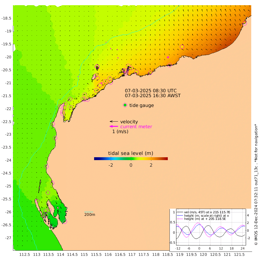 5cm/s -93T +12cm/s rms + 5cm/s -173T. NWSBAR 206m 2cm/s -137T +22cm/s rms + 10cm/s -148T. TAN100 109m 5cm/s -62T +11cm/s rms + 8cm/s -129T. PIL200 208m 11cm/s -32T +13cm/s rms + 7cm/s -137T. PIL100 105m 12cm/s -23T +12cm/s rms + 2cm/s -92T. PIL050 55m 2cm/s -121T +18cm/s rms + 4cm/s -149T. NRSNIN 61m 12cm/s -16T +6cm/s rms + 3cm/s 112T. NW Shelf M6 65m 46cm Withnell Point 50cm Denham 46cm Shark Bay (Inr Bn) 48cm Shark Bay 42cm Useless Loop -9cm Hamelin Pool 58cm Carnarvon 41cm Cape Cuvier 42cm Coral Bay 47cm Norwegian Bay 94cm Badjirrajirra 47cm Tantabiddi 70cm Point Murat 83cm Exmouth 90cm Learmonth 76cm Y Island 58cm North Muiron Island 64cm Roller 69cm Ashburton North 76cm Onslow (Beadon Creek) 71cm Thevenard Island 99cm Large Island 123cm North Sandy Island 96cm Barrow Island (Wapet Landing) 126cm Barrow Island (Tanker Mooring) 115cm Withnell Bay 88cm Trimouille Island 76cm North West Island 108cm Fortescue Road 115cm Steamboat Island 124cm Sholl Island 114cm Fairway Beacon 116cm Mawby Island 116cm Dampier (King Bay) 122cm Cape Legendre 128cm Hauy Island 141cm Port Walcott (Cape Lambert) 139cm Depuch Island 165cm Port Hedland 142cm Bedout Island 150cm Lagrange Bay