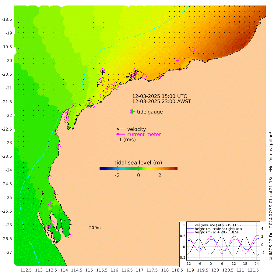 3cm/s -54T +12cm/s rms + 5cm/s -173T. NWSBAR 206m 0cm/s -124T +22cm/s rms + 10cm/s -148T. TAN100 109m 1cm/s 41T +11cm/s rms + 8cm/s -129T. PIL200 208m 2cm/s 28T +13cm/s rms + 7cm/s -137T. PIL100 105m 4cm/s 46T +12cm/s rms + 2cm/s -92T. PIL050 55m 1cm/s -119T +18cm/s rms + 4cm/s -149T. NRSNIN 61m 8cm/s -31T +6cm/s rms + 3cm/s 112T. NW Shelf M6 65m 29cm Withnell Point 28cm Denham 27cm Shark Bay (Inr Bn) 29cm Shark Bay 22cm Useless Loop -6cm Hamelin Pool 39cm Carnarvon 27cm Cape Cuvier 29cm Coral Bay 29cm Norwegian Bay 77cm Badjirrajirra 37cm Tantabiddi 57cm Point Murat 68cm Exmouth 82cm Learmonth 62cm Y Island 47cm North Muiron Island 55cm Roller 63cm Ashburton North 69cm Onslow (Beadon Creek) 66cm Thevenard Island 88cm Large Island 122cm North Sandy Island 94cm Barrow Island (Wapet Landing) 122cm Barrow Island (Tanker Mooring) 131cm Withnell Bay 90cm Trimouille Island 77cm North West Island 101cm Fortescue Road 121cm Steamboat Island 120cm Sholl Island 128cm Fairway Beacon 130cm Mawby Island 132cm Dampier (King Bay) 133cm Cape Legendre 142cm Hauy Island 165cm Port Walcott (Cape Lambert) 179cm Depuch Island 203cm Port Hedland 195cm Bedout Island 203cm Lagrange Bay