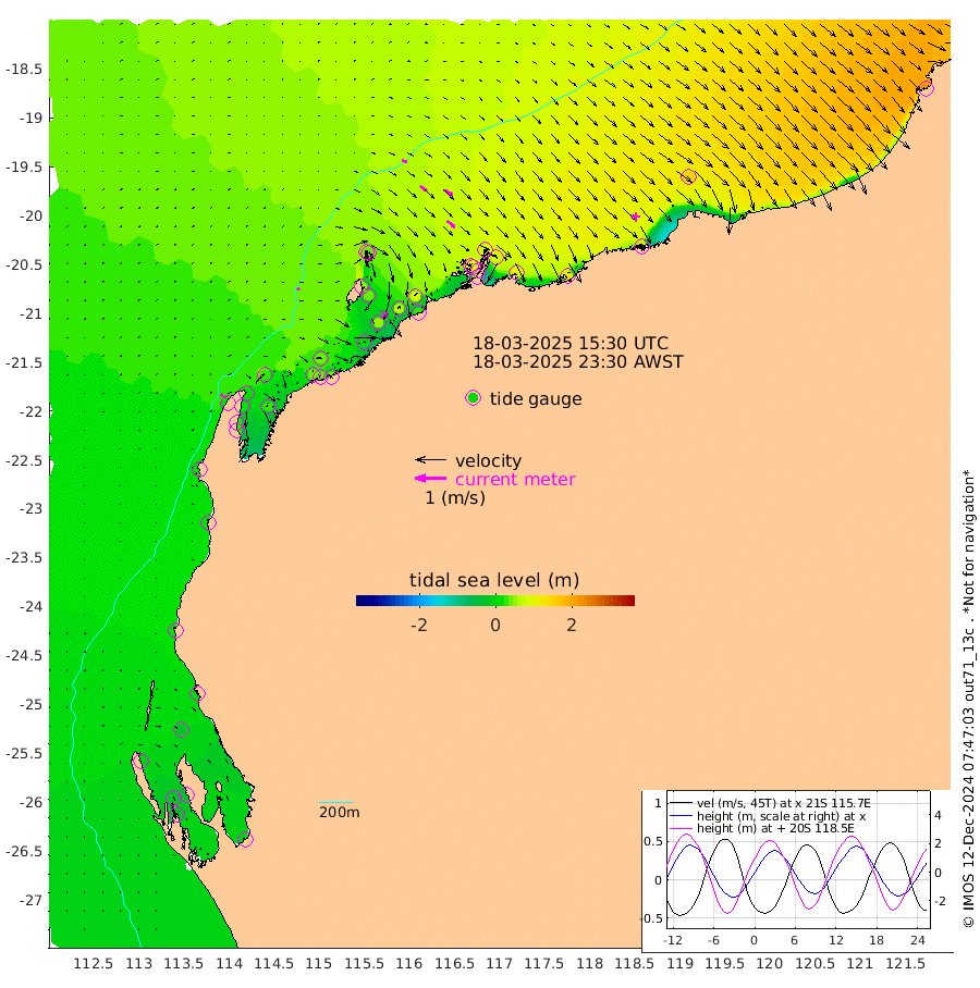 9cm/s 53T +12cm/s rms + 5cm/s -173T. NWSBAR 206m 9cm/s 42T +22cm/s rms + 10cm/s -148T. TAN100 109m 17cm/s 108T +11cm/s rms + 8cm/s -129T. PIL200 208m 28cm/s 128T +13cm/s rms + 7cm/s -137T. PIL100 105m 33cm/s 130T +12cm/s rms + 2cm/s -92T. PIL050 55m 8cm/s 47T +18cm/s rms + 4cm/s -149T. NRSNIN 61m 31cm/s 120T +6cm/s rms + 3cm/s 112T. NW Shelf M6 65m -11cm Withnell Point -26cm Denham -25cm Shark Bay (Inr Bn) -23cm Shark Bay -25cm Useless Loop -1cm Hamelin Pool 3cm Carnarvon 12cm Cape Cuvier 15cm Coral Bay 15cm Norwegian Bay 23cm Badjirrajirra 21cm Tantabiddi 20cm Point Murat 21cm Exmouth 24cm Learmonth 33cm Y Island 27cm North Muiron Island 35cm Roller 36cm Ashburton North 36cm Onslow (Beadon Creek) 37cm Thevenard Island 9cm Large Island 47cm North Sandy Island 46cm Barrow Island (Wapet Landing) 39cm Barrow Island (Tanker Mooring) 87cm Withnell Bay 37cm Trimouille Island 45cm North West Island 28cm Fortescue Road 85cm Steamboat Island 58cm Sholl Island 83cm Fairway Beacon 88cm Mawby Island 85cm Dampier (King Bay) 82cm Cape Legendre 83cm Hauy Island 102cm Port Walcott (Cape Lambert) 121cm Depuch Island 134cm Port Hedland 157cm Bedout Island 214cm Lagrange Bay