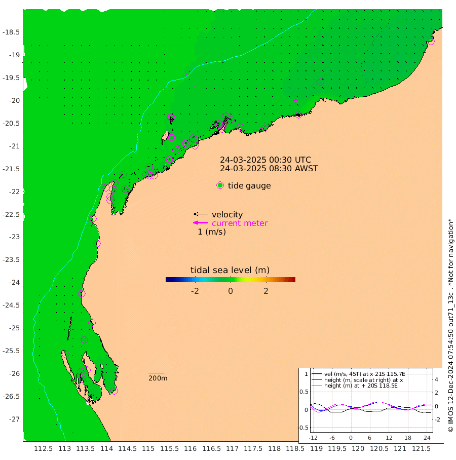 0cm/s -123T +12cm/s rms + 5cm/s -173T. NWSBAR 206m 2cm/s 47T +22cm/s rms + 10cm/s -148T. TAN100 109m 2cm/s -105T +11cm/s rms + 8cm/s -129T. PIL200 208m 1cm/s -175T +13cm/s rms + 7cm/s -137T. PIL100 105m 1cm/s -126T +12cm/s rms + 2cm/s -92T. PIL050 55m 3cm/s 43T +18cm/s rms + 4cm/s -149T. NRSNIN 61m 3cm/s -55T +6cm/s rms + 3cm/s 112T. NW Shelf M6 65m -6cm Withnell Point -16cm Denham -19cm Shark Bay (Inr Bn) -16cm Shark Bay -25cm Useless Loop -12cm Hamelin Pool -3cm Carnarvon -3cm Cape Cuvier -4cm Coral Bay -3cm Norwegian Bay -14cm Badjirrajirra -5cm Tantabiddi -9cm Point Murat -12cm Exmouth -11cm Learmonth -13cm Y Island -9cm North Muiron Island -10cm Roller -9cm Ashburton North -11cm Onslow (Beadon Creek) -9cm Thevenard Island 11cm Large Island -13cm North Sandy Island -13cm Barrow Island (Wapet Landing) -16cm Barrow Island (Tanker Mooring) -18cm Withnell Bay -17cm Trimouille Island -11cm North West Island 20cm Fortescue Road -24cm Steamboat Island -28cm Sholl Island -16cm Fairway Beacon -17cm Mawby Island -18cm Dampier (King Bay) -16cm Cape Legendre -17cm Hauy Island -22cm Port Walcott (Cape Lambert) -16cm Depuch Island -28cm Port Hedland -38cm Bedout Island 31cm Lagrange Bay