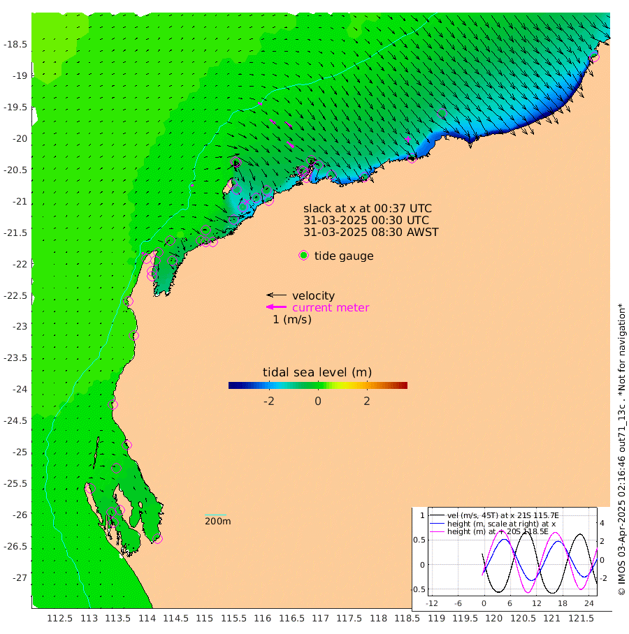 12cm/s 74T +12cm/s rms + 5cm/s -173T. NWSBAR 206m 12cm/s 41T +22cm/s rms + 10cm/s -148T. TAN100 109m 21cm/s 110T +11cm/s rms + 8cm/s -129T. PIL200 208m 38cm/s 128T +13cm/s rms + 7cm/s -137T. PIL100 105m 45cm/s 131T +12cm/s rms + 2cm/s -92T. PIL050 55m 12cm/s 50T +18cm/s rms + 4cm/s -149T. NRSNIN 61m 42cm/s 130T +6cm/s rms + 3cm/s 112T. NW Shelf M6 65m 2cm Withnell Point -13cm Denham -9cm Shark Bay (Inr Bn) -10cm Shark Bay -9cm Useless Loop 0cm Hamelin Pool 5cm Carnarvon 24cm Cape Cuvier 26cm Coral Bay 23cm Norwegian Bay -31cm Badjirrajirra 20cm Tantabiddi -8cm Point Murat -22cm Exmouth -30cm Learmonth -8cm Y Island 9cm North Muiron Island 4cm Roller 3cm Ashburton North -5cm Onslow (Beadon Creek) 2cm Thevenard Island -63cm Large Island -75cm North Sandy Island -25cm Barrow Island (Wapet Landing) -77cm Barrow Island (Tanker Mooring) -29cm Withnell Bay -25cm Trimouille Island -6cm North West Island -73cm Fortescue Road -37cm Steamboat Island -74cm Sholl Island -31cm Fairway Beacon -28cm Mawby Island -30cm Dampier (King Bay) -20cm Cape Legendre -61cm Hauy Island -58cm Port Walcott (Cape Lambert) -75cm Depuch Island -75cm Port Hedland -49cm Bedout Island -26cm Lagrange Bay