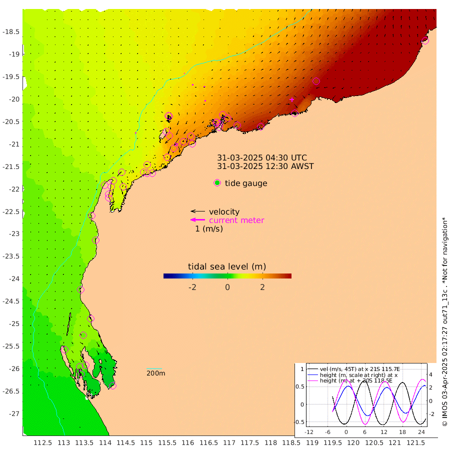 8cm/s -74T +12cm/s rms + 5cm/s -173T. NWSBAR 206m 0cm/s -13T +22cm/s rms + 10cm/s -148T. TAN100 109m 2cm/s -56T +11cm/s rms + 8cm/s -129T. PIL200 208m 6cm/s -5T +13cm/s rms + 7cm/s -137T. PIL100 105m 9cm/s 5T +12cm/s rms + 2cm/s -92T. PIL050 55m 1cm/s -66T +18cm/s rms + 4cm/s -149T. NRSNIN 61m 9cm/s 39T +6cm/s rms + 3cm/s 112T. NW Shelf M6 65m 43cm Withnell Point 38cm Denham 35cm Shark Bay (Inr Bn) 37cm Shark Bay 25cm Useless Loop -14cm Hamelin Pool 63cm Carnarvon 44cm Cape Cuvier 48cm Coral Bay 52cm Norwegian Bay 130cm Badjirrajirra 60cm Tantabiddi 95cm Point Murat 116cm Exmouth 131cm Learmonth 110cm Y Island 81cm North Muiron Island 97cm Roller 104cm Ashburton North 115cm Onslow (Beadon Creek) 108cm Thevenard Island 157cm Large Island 209cm North Sandy Island 155cm Barrow Island (Wapet Landing) 204cm Barrow Island (Tanker Mooring) 216cm Withnell Bay 152cm Trimouille Island 122cm North West Island 183cm Fortescue Road 215cm Steamboat Island 207cm Sholl Island 212cm Fairway Beacon 212cm Mawby Island 215cm Dampier (King Bay) 216cm Cape Legendre 238cm Hauy Island 270cm Port Walcott (Cape Lambert) 305cm Depuch Island 334cm Port Hedland 320cm Bedout Island 377cm Lagrange Bay