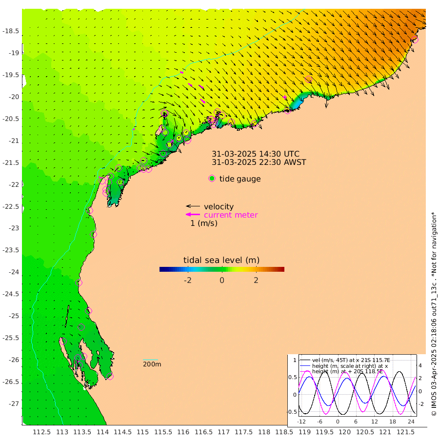 12cm/s 53T +12cm/s rms + 5cm/s -173T. NWSBAR 206m 12cm/s 44T +22cm/s rms + 10cm/s -148T. TAN100 109m 23cm/s 108T +11cm/s rms + 8cm/s -129T. PIL200 208m 37cm/s 126T +13cm/s rms + 7cm/s -137T. PIL100 105m 44cm/s 129T +12cm/s rms + 2cm/s -92T. PIL050 55m 12cm/s 47T +18cm/s rms + 4cm/s -149T. NRSNIN 61m 38cm/s 126T +6cm/s rms + 3cm/s 112T. NW Shelf M6 65m -12cm Withnell Point -36cm Denham -35cm Shark Bay (Inr Bn) -31cm Shark Bay -38cm Useless Loop -7cm Hamelin Pool 9cm Carnarvon 23cm Cape Cuvier 27cm Coral Bay 26cm Norwegian Bay 33cm Badjirrajirra 32cm Tantabiddi 29cm Point Murat 29cm Exmouth 35cm Learmonth 40cm Y Island 35cm North Muiron Island 44cm Roller 50cm Ashburton North 48cm Onslow (Beadon Creek) 51cm Thevenard Island 10cm Large Island 57cm North Sandy Island 62cm Barrow Island (Wapet Landing) 48cm Barrow Island (Tanker Mooring) 109cm Withnell Bay 55cm Trimouille Island 55cm North West Island 30cm Fortescue Road 94cm Steamboat Island 76cm Sholl Island 104cm Fairway Beacon 110cm Mawby Island 109cm Dampier (King Bay) 112cm Cape Legendre 100cm Hauy Island 126cm Port Walcott (Cape Lambert) 128cm Depuch Island 164cm Port Hedland 193cm Bedout Island 230cm Lagrange Bay