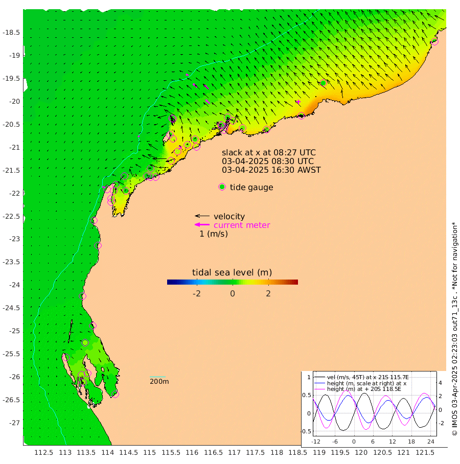 11cm/s -111T +12cm/s rms + 5cm/s -173T. NWSBAR 206m 12cm/s -138T +22cm/s rms + 10cm/s -148T. TAN100 109m 20cm/s -72T +11cm/s rms + 8cm/s -129T. PIL200 208m 35cm/s -50T +13cm/s rms + 7cm/s -137T. PIL100 105m 40cm/s -45T +12cm/s rms + 2cm/s -92T. PIL050 55m 12cm/s -130T +18cm/s rms + 4cm/s -149T. NRSNIN 61m 40cm/s -45T +6cm/s rms + 3cm/s 112T. NW Shelf M6 65m 28cm Withnell Point 53cm Denham 50cm Shark Bay (Inr Bn) 48cm Shark Bay 53cm Useless Loop 5cm Hamelin Pool 21cm Carnarvon -2cm Cape Cuvier -4cm Coral Bay 0cm Norwegian Bay 44cm Badjirrajirra -1cm Tantabiddi 24cm Point Murat 37cm Exmouth 39cm Learmonth 22cm Y Island 8cm North Muiron Island 8cm Roller 10cm Ashburton North 19cm Onslow (Beadon Creek) 11cm Thevenard Island 68cm Large Island 60cm North Sandy Island 31cm Barrow Island (Wapet Landing) 70cm Barrow Island (Tanker Mooring) 23cm Withnell Bay 26cm Trimouille Island 16cm North West Island 74cm Fortescue Road 32cm Steamboat Island 52cm Sholl Island 26cm Fairway Beacon 23cm Mawby Island 24cm Dampier (King Bay) 26cm Cape Legendre 46cm Hauy Island 41cm Port Walcott (Cape Lambert) 44cm Depuch Island 45cm Port Hedland 15cm Bedout Island 0cm Lagrange Bay