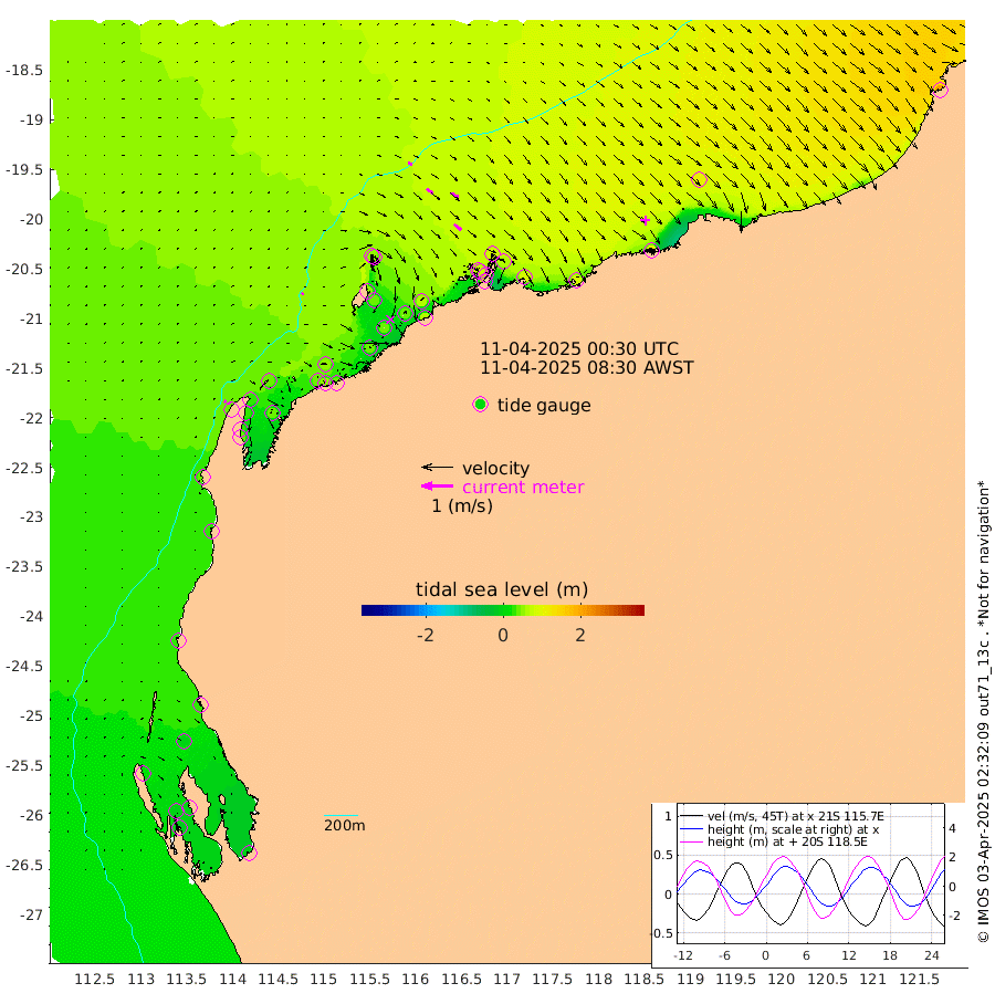 6cm/s 50T +12cm/s rms + 5cm/s -173T. NWSBAR 206m 9cm/s 43T +22cm/s rms + 10cm/s -148T. TAN100 109m 13cm/s 109T +11cm/s rms + 8cm/s -129T. PIL200 208m 24cm/s 124T +13cm/s rms + 7cm/s -137T. PIL100 105m 28cm/s 126T +12cm/s rms + 2cm/s -92T. PIL050 55m 9cm/s 48T +18cm/s rms + 4cm/s -149T. NRSNIN 61m 26cm/s 119T +6cm/s rms + 3cm/s 112T. NW Shelf M6 65m 11cm Withnell Point -6cm Denham -6cm Shark Bay (Inr Bn) -5cm Shark Bay -12cm Useless Loop -10cm Hamelin Pool 25cm Carnarvon 30cm Cape Cuvier 33cm Coral Bay 35cm Norwegian Bay 33cm Badjirrajirra 35cm Tantabiddi 32cm Point Murat 32cm Exmouth 36cm Learmonth 39cm Y Island 37cm North Muiron Island 41cm Roller 46cm Ashburton North 44cm Onslow (Beadon Creek) 46cm Thevenard Island 38cm Large Island 43cm North Sandy Island 51cm Barrow Island (Wapet Landing) 38cm Barrow Island (Tanker Mooring) 77cm Withnell Bay 42cm Trimouille Island 45cm North West Island 59cm Fortescue Road 60cm Steamboat Island 39cm Sholl Island 74cm Fairway Beacon 77cm Mawby Island 76cm Dampier (King Bay) 84cm Cape Legendre 66cm Hauy Island 84cm Port Walcott (Cape Lambert) 87cm Depuch Island 103cm Port Hedland 111cm Bedout Island 210cm Lagrange Bay