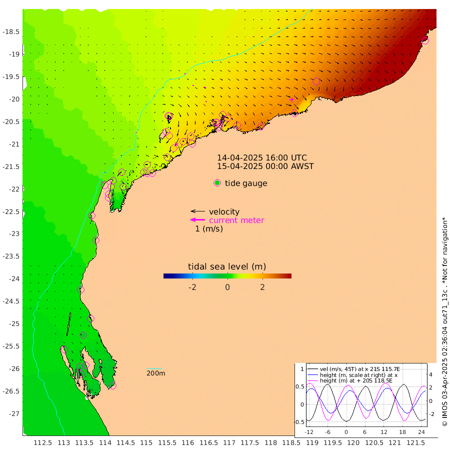 5cm/s -30T +12cm/s rms + 5cm/s -173T. NWSBAR 206m 3cm/s 50T +22cm/s rms + 10cm/s -148T. TAN100 109m 5cm/s 93T +11cm/s rms + 8cm/s -129T. PIL200 208m 7cm/s 103T +13cm/s rms + 7cm/s -137T. PIL100 105m 8cm/s 102T +12cm/s rms + 2cm/s -92T. PIL050 55m 3cm/s 43T +18cm/s rms + 4cm/s -149T. NRSNIN 61m 12cm/s 103T +6cm/s rms + 3cm/s 112T. NW Shelf M6 65m 4cm Withnell Point -12cm Denham -15cm Shark Bay (Inr Bn) -12cm Shark Bay -23cm Useless Loop -15cm Hamelin Pool 25cm Carnarvon 20cm Cape Cuvier 23cm Coral Bay 26cm Norwegian Bay 77cm Badjirrajirra 33cm Tantabiddi 54cm Point Murat 66cm Exmouth 82cm Learmonth 66cm Y Island 48cm North Muiron Island 62cm Roller 66cm Ashburton North 72cm Onslow (Beadon Creek) 68cm Thevenard Island 110cm Large Island 142cm North Sandy Island 102cm Barrow Island (Wapet Landing) 134cm Barrow Island (Tanker Mooring) 154cm Withnell Bay 100cm Trimouille Island 82cm North West Island 137cm Fortescue Road 150cm Steamboat Island 150cm Sholl Island 151cm Fairway Beacon 153cm Mawby Island 155cm Dampier (King Bay) 148cm Cape Legendre 173cm Hauy Island 197cm Port Walcott (Cape Lambert) 227cm Depuch Island 250cm Port Hedland 241cm Bedout Island 349cm Lagrange Bay