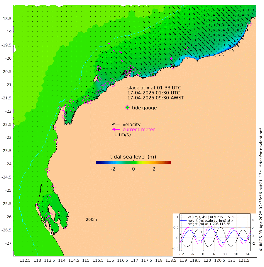 8cm/s 73T +12cm/s rms + 5cm/s -173T. NWSBAR 206m 11cm/s 40T +22cm/s rms + 10cm/s -148T. TAN100 109m 16cm/s 109T +11cm/s rms + 8cm/s -129T. PIL200 208m 29cm/s 128T +13cm/s rms + 7cm/s -137T. PIL100 105m 35cm/s 131T +12cm/s rms + 2cm/s -92T. PIL050 55m 11cm/s 48T +18cm/s rms + 4cm/s -149T. NRSNIN 61m 35cm/s 132T +6cm/s rms + 3cm/s 112T. NW Shelf M6 65m 17cm Withnell Point 3cm Denham 4cm Shark Bay (Inr Bn) 7cm Shark Bay 1cm Useless Loop -6cm Hamelin Pool 23cm Carnarvon 35cm Cape Cuvier 36cm Coral Bay 32cm Norwegian Bay -3cm Badjirrajirra 33cm Tantabiddi 13cm Point Murat 4cm Exmouth -5cm Learmonth 15cm Y Island 26cm North Muiron Island 25cm Roller 23cm Ashburton North 17cm Onslow (Beadon Creek) 23cm Thevenard Island -51cm Large Island -25cm North Sandy Island 5cm Barrow Island (Wapet Landing) -30cm Barrow Island (Tanker Mooring) 10cm Withnell Bay 8cm Trimouille Island 18cm North West Island -67cm Fortescue Road 12cm Steamboat Island -29cm Sholl Island 7cm Fairway Beacon 8cm Mawby Island 8cm Dampier (King Bay) 16cm Cape Legendre -13cm Hauy Island -9cm Port Walcott (Cape Lambert) -9cm Depuch Island -16cm Port Hedland 8cm Bedout Island -34cm Lagrange Bay