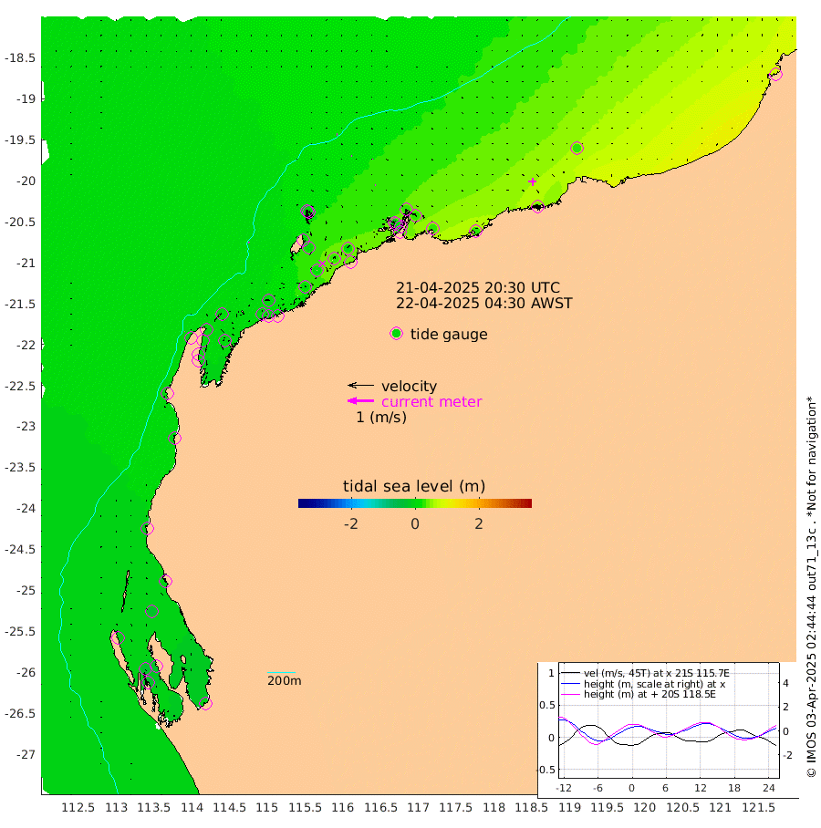 3cm/s -31T +12cm/s rms + 5cm/s -173T. NWSBAR 206m 1cm/s 52T +22cm/s rms + 10cm/s -148T. TAN100 109m 2cm/s 84T +11cm/s rms + 8cm/s -129T. PIL200 208m 1cm/s 104T +13cm/s rms + 7cm/s -137T. PIL100 105m 2cm/s 78T +12cm/s rms + 2cm/s -92T. PIL050 55m 1cm/s 59T +18cm/s rms + 4cm/s -149T. NRSNIN 61m 1cm/s 1T +6cm/s rms + 3cm/s 112T. NW Shelf M6 65m -11cm Withnell Point -24cm Denham -24cm Shark Bay (Inr Bn) -26cm Shark Bay -30cm Useless Loop -8cm Hamelin Pool -3cm Carnarvon -3cm Cape Cuvier -2cm Coral Bay 3cm Norwegian Bay 10cm Badjirrajirra -1cm Tantabiddi 4cm Point Murat 7cm Exmouth 10cm Learmonth 8cm Y Island 2cm North Muiron Island 5cm Roller 5cm Ashburton North 7cm Onslow (Beadon Creek) 5cm Thevenard Island 21cm Large Island 19cm North Sandy Island 12cm Barrow Island (Wapet Landing) 19cm Barrow Island (Tanker Mooring) 20cm Withnell Bay 16cm Trimouille Island -2cm North West Island 35cm Fortescue Road 13cm Steamboat Island 28cm Sholl Island 21cm Fairway Beacon 21cm Mawby Island 20cm Dampier (King Bay) 25cm Cape Legendre 24cm Hauy Island 26cm Port Walcott (Cape Lambert) 23cm Depuch Island 35cm Port Hedland 26cm Bedout Island 88cm Lagrange Bay