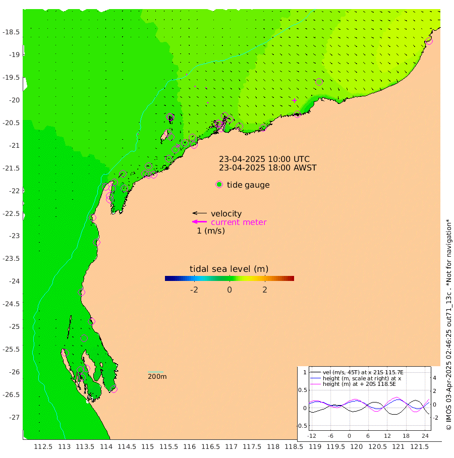 3cm/s 43T +12cm/s rms + 5cm/s -173T. NWSBAR 206m 1cm/s 53T +22cm/s rms + 10cm/s -148T. TAN100 109m 5cm/s 104T +11cm/s rms + 8cm/s -129T. PIL200 208m 7cm/s 121T +13cm/s rms + 7cm/s -137T. PIL100 105m 8cm/s 123T +12cm/s rms + 2cm/s -92T. PIL050 55m 1cm/s 34T +18cm/s rms + 4cm/s -149T. NRSNIN 61m 5cm/s 56T +6cm/s rms + 3cm/s 112T. NW Shelf M6 65m 15cm Withnell Point 13cm Denham 12cm Shark Bay (Inr Bn) 16cm Shark Bay 12cm Useless Loop -4cm Hamelin Pool 22cm Carnarvon 20cm Cape Cuvier 21cm Coral Bay 23cm Norwegian Bay 28cm Badjirrajirra 22cm Tantabiddi 24cm Point Murat 26cm Exmouth 22cm Learmonth 29cm Y Island 24cm North Muiron Island 25cm Roller 26cm Ashburton North 27cm Onslow (Beadon Creek) 27cm Thevenard Island 25cm Large Island 24cm North Sandy Island 30cm Barrow Island (Wapet Landing) 27cm Barrow Island (Tanker Mooring) 37cm Withnell Bay 17cm Trimouille Island 28cm North West Island 32cm Fortescue Road 37cm Steamboat Island 29cm Sholl Island 36cm Fairway Beacon 39cm Mawby Island 37cm Dampier (King Bay) 44cm Cape Legendre 38cm Hauy Island 39cm Port Walcott (Cape Lambert) 33cm Depuch Island 44cm Port Hedland 44cm Bedout Island 71cm Lagrange Bay