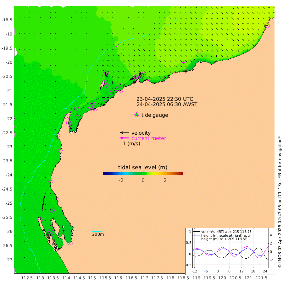 4cm/s 32T +12cm/s rms + 5cm/s -173T. NWSBAR 206m 5cm/s 44T +22cm/s rms + 10cm/s -148T. TAN100 109m 7cm/s 108T +11cm/s rms + 8cm/s -129T. PIL200 208m 13cm/s 124T +13cm/s rms + 7cm/s -137T. PIL100 105m 15cm/s 123T +12cm/s rms + 2cm/s -92T. PIL050 55m 5cm/s 49T +18cm/s rms + 4cm/s -149T. NRSNIN 61m 9cm/s 125T +6cm/s rms + 3cm/s 112T. NW Shelf M6 65m 1cm Withnell Point -14cm Denham -13cm Shark Bay (Inr Bn) -14cm Shark Bay -19cm Useless Loop -8cm Hamelin Pool 11cm Carnarvon 13cm Cape Cuvier 14cm Coral Bay 18cm Norwegian Bay 14cm Badjirrajirra 14cm Tantabiddi 13cm Point Murat 13cm Exmouth 12cm Learmonth 18cm Y Island 16cm North Muiron Island 17cm Roller 19cm Ashburton North 19cm Onslow (Beadon Creek) 20cm Thevenard Island 7cm Large Island 14cm North Sandy Island 21cm Barrow Island (Wapet Landing) 13cm Barrow Island (Tanker Mooring) 33cm Withnell Bay 23cm Trimouille Island 11cm North West Island 21cm Fortescue Road 22cm Steamboat Island 18cm Sholl Island 32cm Fairway Beacon 31cm Mawby Island 32cm Dampier (King Bay) 43cm Cape Legendre 27cm Hauy Island 34cm Port Walcott (Cape Lambert) 31cm Depuch Island 41cm Port Hedland 45cm Bedout Island 86cm Lagrange Bay