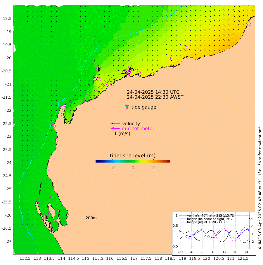 6cm/s -91T +12cm/s rms + 5cm/s -173T. NWSBAR 206m 4cm/s -138T +22cm/s rms + 10cm/s -148T. TAN100 109m 6cm/s -64T +11cm/s rms + 8cm/s -129T. PIL200 208m 10cm/s -45T +13cm/s rms + 7cm/s -137T. PIL100 105m 11cm/s -38T +12cm/s rms + 2cm/s -92T. PIL050 55m 4cm/s -129T +18cm/s rms + 4cm/s -149T. NRSNIN 61m 11cm/s -40T +6cm/s rms + 3cm/s 112T. NW Shelf M6 65m 12cm Withnell Point 16cm Denham 15cm Shark Bay (Inr Bn) 14cm Shark Bay 12cm Useless Loop -4cm Hamelin Pool 13cm Carnarvon 3cm Cape Cuvier 3cm Coral Bay 3cm Norwegian Bay 34cm Badjirrajirra 8cm Tantabiddi 22cm Point Murat 30cm Exmouth 41cm Learmonth 24cm Y Island 16cm North Muiron Island 22cm Roller 22cm Ashburton North 27cm Onslow (Beadon Creek) 24cm Thevenard Island 49cm Large Island 68cm North Sandy Island 42cm Barrow Island (Wapet Landing) 66cm Barrow Island (Tanker Mooring) 60cm Withnell Bay 42cm Trimouille Island 36cm North West Island 54cm Fortescue Road 62cm Steamboat Island 59cm Sholl Island 59cm Fairway Beacon 60cm Mawby Island 60cm Dampier (King Bay) 56cm Cape Legendre 76cm Hauy Island 82cm Port Walcott (Cape Lambert) 110cm Depuch Island 103cm Port Hedland 83cm Bedout Island 111cm Lagrange Bay