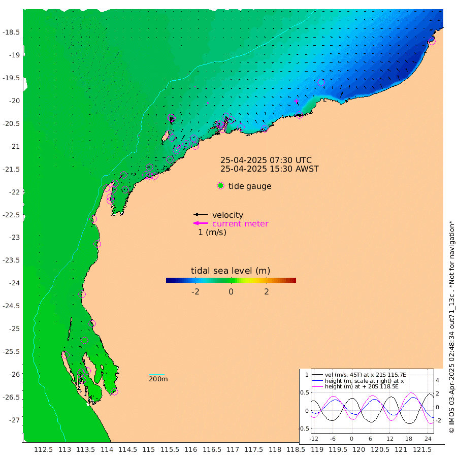 5cm/s 124T +12cm/s rms + 5cm/s -173T. NWSBAR 206m 2cm/s -138T +22cm/s rms + 10cm/s -148T. TAN100 109m 2cm/s -95T +11cm/s rms + 8cm/s -129T. PIL200 208m 6cm/s -80T +13cm/s rms + 7cm/s -137T. PIL100 105m 8cm/s -87T +12cm/s rms + 2cm/s -92T. PIL050 55m 2cm/s -138T +18cm/s rms + 4cm/s -149T. NRSNIN 61m 6cm/s -90T +6cm/s rms + 3cm/s 112T. NW Shelf M6 65m -24cm Withnell Point -12cm Denham -11cm Shark Bay (Inr Bn) -10cm Shark Bay -1cm Useless Loop 14cm Hamelin Pool -37cm Carnarvon -28cm Cape Cuvier -29cm Coral Bay -33cm Norwegian Bay -67cm Badjirrajirra -37cm Tantabiddi -51cm Point Murat -60cm Exmouth -72cm Learmonth -59cm Y Island -47cm North Muiron Island -57cm Roller -59cm Ashburton North -64cm Onslow (Beadon Creek) -62cm Thevenard Island -69cm Large Island -108cm North Sandy Island -85cm Barrow Island (Wapet Landing) -105cm Barrow Island (Tanker Mooring) -123cm Withnell Bay -87cm Trimouille Island -68cm North West Island -84cm Fortescue Road -116cm Steamboat Island -102cm Sholl Island -119cm Fairway Beacon -119cm Mawby Island -121cm Dampier (King Bay) -127cm Cape Legendre -132cm Hauy Island -149cm Port Walcott (Cape Lambert) -179cm Depuch Island -185cm Port Hedland -168cm Bedout Island -228cm Lagrange Bay