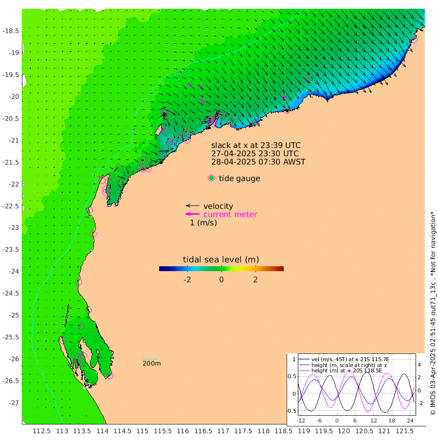 11cm/s 75T +12cm/s rms + 5cm/s -173T. NWSBAR 206m 11cm/s 41T +22cm/s rms + 10cm/s -148T. TAN100 109m 19cm/s 108T +11cm/s rms + 8cm/s -129T. PIL200 208m 34cm/s 128T +13cm/s rms + 7cm/s -137T. PIL100 105m 40cm/s 130T +12cm/s rms + 2cm/s -92T. PIL050 55m 12cm/s 49T +18cm/s rms + 4cm/s -149T. NRSNIN 61m 35cm/s 129T +6cm/s rms + 3cm/s 112T. NW Shelf M6 65m 13cm Withnell Point -1cm Denham 1cm Shark Bay (Inr Bn) 2cm Shark Bay 0cm Useless Loop -2cm Hamelin Pool 17cm Carnarvon 33cm Cape Cuvier 34cm Coral Bay 32cm Norwegian Bay -15cm Badjirrajirra 28cm Tantabiddi 4cm Point Murat -8cm Exmouth -16cm Learmonth 5cm Y Island 19cm North Muiron Island 14cm Roller 14cm Ashburton North 7cm Onslow (Beadon Creek) 13cm Thevenard Island -59cm Large Island -57cm North Sandy Island -11cm Barrow Island (Wapet Landing) -58cm Barrow Island (Tanker Mooring) -15cm Withnell Bay -13cm Trimouille Island 4cm North West Island -70cm Fortescue Road -22cm Steamboat Island -55cm Sholl Island -18cm Fairway Beacon -15cm Mawby Island -17cm Dampier (King Bay) -5cm Cape Legendre -46cm Hauy Island -43cm Port Walcott (Cape Lambert) -61cm Depuch Island -59cm Port Hedland -39cm Bedout Island -54cm Lagrange Bay