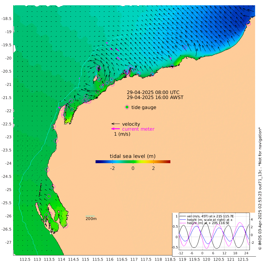 10cm/s -139T +12cm/s rms + 5cm/s -173T. NWSBAR 206m 15cm/s -138T +22cm/s rms + 10cm/s -148T. TAN100 109m 22cm/s -75T +11cm/s rms + 8cm/s -129T. PIL200 208m 38cm/s -56T +13cm/s rms + 7cm/s -137T. PIL100 105m 46cm/s -54T +12cm/s rms + 2cm/s -92T. PIL050 55m 15cm/s -133T +18cm/s rms + 4cm/s -149T. NRSNIN 61m 45cm/s -55T +6cm/s rms + 3cm/s 112T. NW Shelf M6 65m -18cm Withnell Point 20cm Denham 20cm Shark Bay (Inr Bn) 16cm Shark Bay 34cm Useless Loop 24cm Hamelin Pool -46cm Carnarvon -57cm Cape Cuvier -60cm Coral Bay -60cm Norwegian Bay -67cm Badjirrajirra -64cm Tantabiddi -62cm Point Murat -62cm Exmouth -72cm Learmonth -72cm Y Island -68cm North Muiron Island -79cm Roller -82cm Ashburton North -81cm Onslow (Beadon Creek) -85cm Thevenard Island -37cm Large Island -95cm North Sandy Island -96cm Barrow Island (Wapet Landing) -83cm Barrow Island (Tanker Mooring) -143cm Withnell Bay -92cm Trimouille Island -88cm North West Island -48cm Fortescue Road -130cm Steamboat Island -104cm Sholl Island -138cm Fairway Beacon -145cm Mawby Island -143cm Dampier (King Bay) -152cm Cape Legendre -132cm Hauy Island -160cm Port Walcott (Cape Lambert) -165cm Depuch Island -195cm Port Hedland -202cm Bedout Island -257cm Lagrange Bay