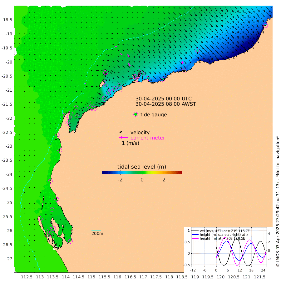 10cm/s 84T +12cm/s rms + 5cm/s -173T. NWSBAR 206m 11cm/s 40T +22cm/s rms + 10cm/s -148T. TAN100 109m 15cm/s 108T +11cm/s rms + 8cm/s -129T. PIL200 208m 29cm/s 130T +13cm/s rms + 7cm/s -137T. PIL100 105m 35cm/s 134T +12cm/s rms + 2cm/s -92T. PIL050 55m 11cm/s 49T +18cm/s rms + 4cm/s -149T. NRSNIN 61m 33cm/s 133T +6cm/s rms + 3cm/s 112T. NW Shelf M6 65m 11cm Withnell Point -1cm Denham 1cm Shark Bay (Inr Bn) 3cm Shark Bay 1cm Useless Loop -3cm Hamelin Pool 10cm Carnarvon 27cm Cape Cuvier 27cm Coral Bay 22cm Norwegian Bay -40cm Badjirrajirra 18cm Tantabiddi -13cm Point Murat -29cm Exmouth -41cm Learmonth -16cm Y Island 5cm North Muiron Island -3cm Roller -6cm Ashburton North -17cm Onslow (Beadon Creek) -8cm Thevenard Island -86cm Large Island -92cm North Sandy Island -43cm Barrow Island (Wapet Landing) -96cm Barrow Island (Tanker Mooring) -63cm Withnell Bay -46cm Trimouille Island -18cm North West Island -108cm Fortescue Road -68cm Steamboat Island -100cm Sholl Island -65cm Fairway Beacon -62cm Mawby Island -65cm Dampier (King Bay) -58cm Cape Legendre -98cm Hauy Island -102cm Port Walcott (Cape Lambert) -120cm Depuch Island -135cm Port Hedland -114cm Bedout Island -148cm Lagrange Bay