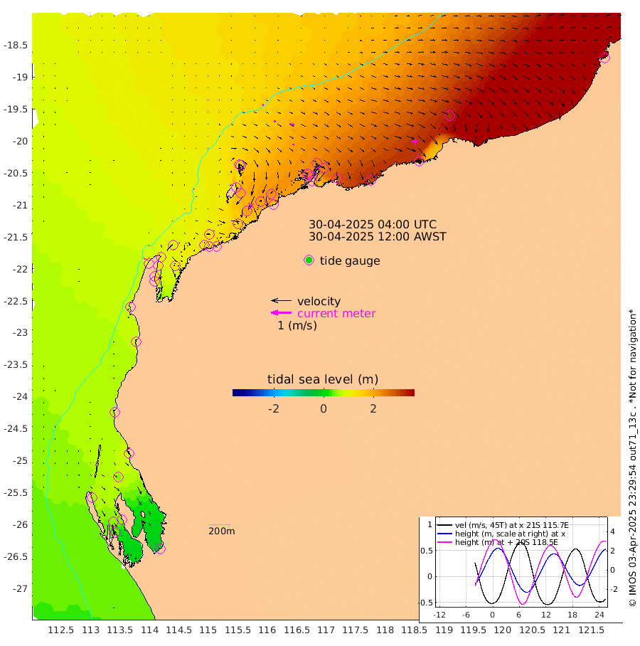 4cm/s -38T +12cm/s rms + 5cm/s -173T. NWSBAR 206m 4cm/s 40T +22cm/s rms + 10cm/s -148T. TAN100 109m 5cm/s 100T +11cm/s rms + 8cm/s -129T. PIL200 208m 9cm/s 94T +13cm/s rms + 7cm/s -137T. PIL100 105m 11cm/s 93T +12cm/s rms + 2cm/s -92T. PIL050 55m 4cm/s 40T +18cm/s rms + 4cm/s -149T. NRSNIN 61m 20cm/s 98T +6cm/s rms + 3cm/s 112T. NW Shelf M6 65m 58cm Withnell Point 50cm Denham 47cm Shark Bay (Inr Bn) 52cm Shark Bay 38cm Useless Loop -14cm Hamelin Pool 80cm Carnarvon 65cm Cape Cuvier 70cm Coral Bay 72cm Norwegian Bay 140cm Badjirrajirra 80cm Tantabiddi 109cm Point Murat 126cm Exmouth 139cm Learmonth 124cm Y Island 99cm North Muiron Island 115cm Roller 121cm Ashburton North 131cm Onslow (Beadon Creek) 125cm Thevenard Island 153cm Large Island 204cm North Sandy Island 166cm Barrow Island (Wapet Landing) 201cm Barrow Island (Tanker Mooring) 225cm Withnell Bay 155cm Trimouille Island 140cm North West Island 175cm Fortescue Road 222cm Steamboat Island 201cm Sholl Island 221cm Fairway Beacon 225cm Mawby Island 225cm Dampier (King Bay) 229cm Cape Legendre 237cm Hauy Island 273cm Port Walcott (Cape Lambert) 294cm Depuch Island 332cm Port Hedland 325cm Bedout Island 406cm Lagrange Bay