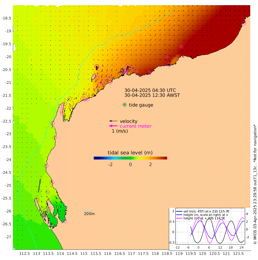6cm/s -71T +12cm/s rms + 5cm/s -173T. NWSBAR 206m 1cm/s 26T +22cm/s rms + 10cm/s -148T. TAN100 109m 1cm/s -15T +11cm/s rms + 8cm/s -129T. PIL200 208m 6cm/s 12T +13cm/s rms + 7cm/s -137T. PIL100 105m 8cm/s 20T +12cm/s rms + 2cm/s -92T. PIL050 55m 1cm/s -39T +18cm/s rms + 4cm/s -149T. NRSNIN 61m 12cm/s 68T +6cm/s rms + 3cm/s 112T. NW Shelf M6 65m 58cm Withnell Point 55cm Denham 52cm Shark Bay (Inr Bn) 56cm Shark Bay 44cm Useless Loop -12cm Hamelin Pool 77cm Carnarvon 57cm Cape Cuvier 62cm Coral Bay 64cm Norwegian Bay 141cm Badjirrajirra 72cm Tantabiddi 107cm Point Murat 126cm Exmouth 140cm Learmonth 120cm Y Island 92cm North Muiron Island 108cm Roller 114cm Ashburton North 126cm Onslow (Beadon Creek) 119cm Thevenard Island 164cm Large Island 210cm North Sandy Island 163cm Barrow Island (Wapet Landing) 209cm Barrow Island (Tanker Mooring) 219cm Withnell Bay 153cm Trimouille Island 134cm North West Island 187cm Fortescue Road 219cm Steamboat Island 206cm Sholl Island 216cm Fairway Beacon 218cm Mawby Island 219cm Dampier (King Bay) 222cm Cape Legendre 238cm Hauy Island 271cm Port Walcott (Cape Lambert) 293cm Depuch Island 329cm Port Hedland 315cm Bedout Island 393cm Lagrange Bay