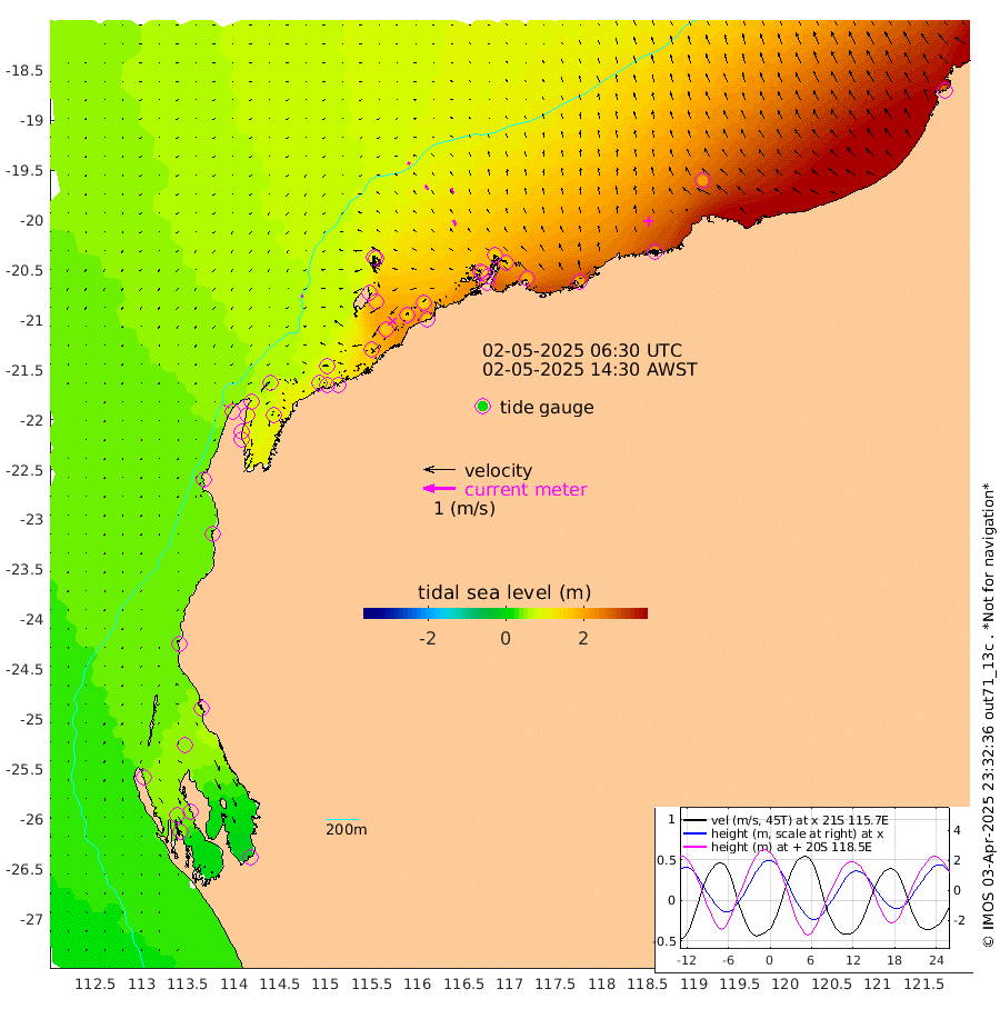 7cm/s -89T +12cm/s rms + 5cm/s -173T. NWSBAR 206m 5cm/s -137T +22cm/s rms + 10cm/s -148T. TAN100 109m 7cm/s -66T +11cm/s rms + 8cm/s -129T. PIL200 208m 16cm/s -38T +13cm/s rms + 7cm/s -137T. PIL100 105m 18cm/s -30T +12cm/s rms + 2cm/s -92T. PIL050 55m 5cm/s -128T +18cm/s rms + 4cm/s -149T. NRSNIN 61m 17cm/s -20T +6cm/s rms + 3cm/s 112T. NW Shelf M6 65m 50cm Withnell Point 56cm Denham 53cm Shark Bay (Inr Bn) 56cm Shark Bay 49cm Useless Loop -7cm Hamelin Pool 60cm Carnarvon 39cm Cape Cuvier 41cm Coral Bay 44cm Norwegian Bay 113cm Badjirrajirra 49cm Tantabiddi 82cm Point Murat 100cm Exmouth 111cm Learmonth 90cm Y Island 65cm North Muiron Island 75cm Roller 81cm Ashburton North 91cm Onslow (Beadon Creek) 84cm Thevenard Island 153cm Large Island 162cm North Sandy Island 121cm Barrow Island (Wapet Landing) 167cm Barrow Island (Tanker Mooring) 152cm Withnell Bay 110cm Trimouille Island 96cm North West Island 168cm Fortescue Road 152cm Steamboat Island 161cm Sholl Island 151cm Fairway Beacon 153cm Mawby Island 154cm Dampier (King Bay) 154cm Cape Legendre 173cm Hauy Island 193cm Port Walcott (Cape Lambert) 199cm Depuch Island 232cm Port Hedland 208cm Bedout Island 269cm Lagrange Bay