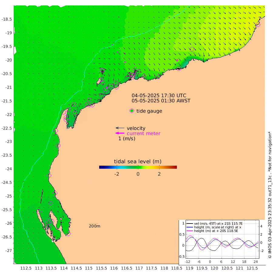 3cm/s 42T +12cm/s rms + 5cm/s -173T. NWSBAR 206m 4cm/s 42T +22cm/s rms + 10cm/s -148T. TAN100 109m 9cm/s 104T +11cm/s rms + 8cm/s -129T. PIL200 208m 13cm/s 125T +13cm/s rms + 7cm/s -137T. PIL100 105m 15cm/s 130T +12cm/s rms + 2cm/s -92T. PIL050 55m 3cm/s 54T +18cm/s rms + 4cm/s -149T. NRSNIN 61m 22cm/s 122T +6cm/s rms + 3cm/s 112T. NW Shelf M6 65m -24cm Withnell Point -35cm Denham -32cm Shark Bay (Inr Bn) -37cm Shark Bay -32cm Useless Loop 2cm Hamelin Pool -18cm Carnarvon -8cm Cape Cuvier -6cm Coral Bay -4cm Norwegian Bay -4cm Badjirrajirra -4cm Tantabiddi -6cm Point Murat -6cm Exmouth 1cm Learmonth 1cm Y Island -1cm North Muiron Island 3cm Roller 2cm Ashburton North 2cm Onslow (Beadon Creek) 2cm Thevenard Island 14cm Large Island 6cm North Sandy Island 6cm Barrow Island (Wapet Landing) 2cm Barrow Island (Tanker Mooring) 22cm Withnell Bay 10cm Trimouille Island 3cm North West Island 26cm Fortescue Road 19cm Steamboat Island 19cm Sholl Island 21cm Fairway Beacon 23cm Mawby Island 22cm Dampier (King Bay) 17cm Cape Legendre 20cm Hauy Island 29cm Port Walcott (Cape Lambert) 33cm Depuch Island 44cm Port Hedland 49cm Bedout Island 151cm Lagrange Bay