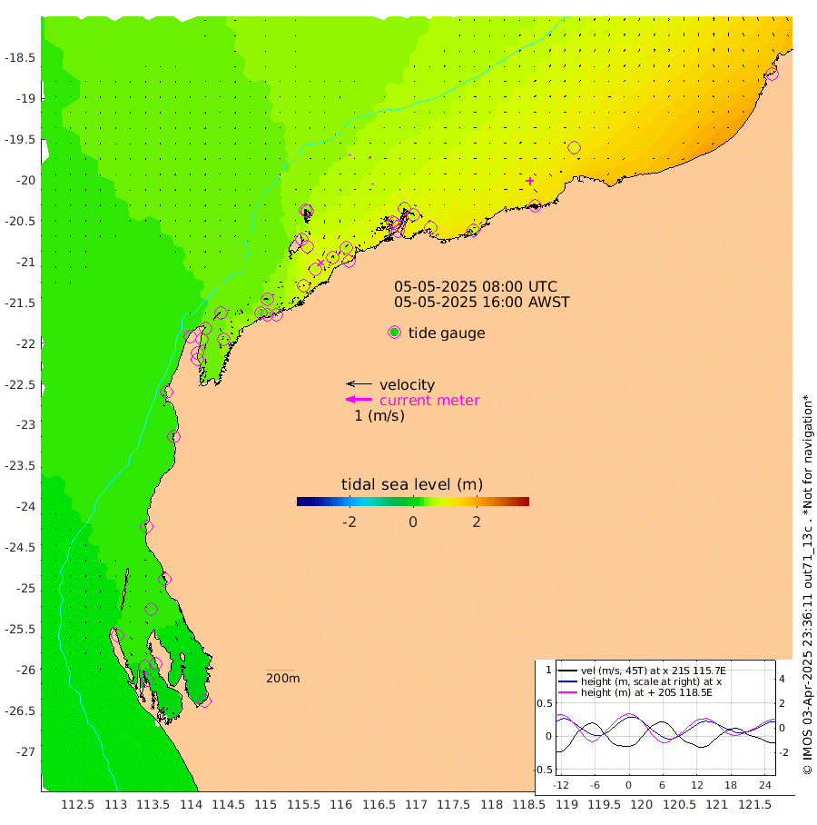 1cm/s -6T +12cm/s rms + 5cm/s -173T. NWSBAR 206m 1cm/s -147T +22cm/s rms + 10cm/s -148T. TAN100 109m 1cm/s 82T +11cm/s rms + 8cm/s -129T. PIL200 208m 2cm/s -5T +13cm/s rms + 7cm/s -137T. PIL100 105m 3cm/s 16T +12cm/s rms + 2cm/s -92T. PIL050 55m 1cm/s -126T +18cm/s rms + 4cm/s -149T. NRSNIN 61m 7cm/s -19T +6cm/s rms + 3cm/s 112T. NW Shelf M6 65m 24cm Withnell Point 25cm Denham 24cm Shark Bay (Inr Bn) 28cm Shark Bay 22cm Useless Loop -4cm Hamelin Pool 32cm Carnarvon 25cm Cape Cuvier 27cm Coral Bay 28cm Norwegian Bay 54cm Badjirrajirra 29cm Tantabiddi 41cm Point Murat 48cm Exmouth 51cm Learmonth 47cm Y Island 36cm North Muiron Island 39cm Roller 43cm Ashburton North 46cm Onslow (Beadon Creek) 45cm Thevenard Island 94cm Large Island 71cm North Sandy Island 58cm Barrow Island (Wapet Landing) 73cm Barrow Island (Tanker Mooring) 70cm Withnell Bay 49cm Trimouille Island 46cm North West Island 102cm Fortescue Road 62cm Steamboat Island 77cm Sholl Island 69cm Fairway Beacon 71cm Mawby Island 72cm Dampier (King Bay) 71cm Cape Legendre 75cm Hauy Island 86cm Port Walcott (Cape Lambert) 74cm Depuch Island 101cm Port Hedland 98cm Bedout Island 160cm Lagrange Bay