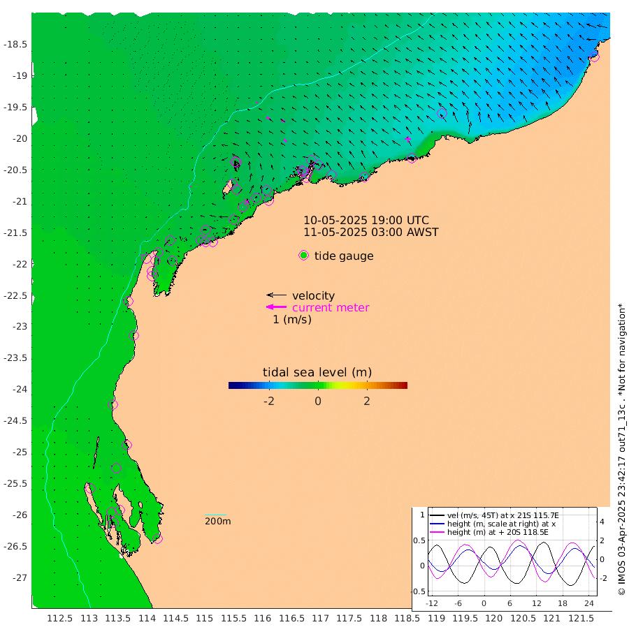 5cm/s -151T +12cm/s rms + 5cm/s -173T. NWSBAR 206m 4cm/s -134T +22cm/s rms + 10cm/s -148T. TAN100 109m 8cm/s -68T +11cm/s rms + 8cm/s -129T. PIL200 208m 15cm/s -57T +13cm/s rms + 7cm/s -137T. PIL100 105m 18cm/s -55T +12cm/s rms + 2cm/s -92T. PIL050 55m 4cm/s -136T +18cm/s rms + 4cm/s -149T. NRSNIN 61m 20cm/s -67T +6cm/s rms + 3cm/s 112T. NW Shelf M6 65m -6cm Withnell Point -3cm Denham -1cm Shark Bay (Inr Bn) -6cm Shark Bay -3cm Useless Loop 1cm Hamelin Pool -16cm Carnarvon -16cm Cape Cuvier -19cm Coral Bay -19cm Norwegian Bay -39cm Badjirrajirra -24cm Tantabiddi -30cm Point Murat -35cm Exmouth -38cm Learmonth -41cm Y Island -31cm North Muiron Island -38cm Roller -42cm Ashburton North -43cm Onslow (Beadon Creek) -43cm Thevenard Island -42cm Large Island -64cm North Sandy Island -58cm Barrow Island (Wapet Landing) -60cm Barrow Island (Tanker Mooring) -91cm Withnell Bay -40cm Trimouille Island -51cm North West Island -70cm Fortescue Road -81cm Steamboat Island -65cm Sholl Island -88cm Fairway Beacon -90cm Mawby Island -91cm Dampier (King Bay) -89cm Cape Legendre -92cm Hauy Island -110cm Port Walcott (Cape Lambert) -119cm Depuch Island -140cm Port Hedland -156cm Bedout Island -222cm Lagrange Bay