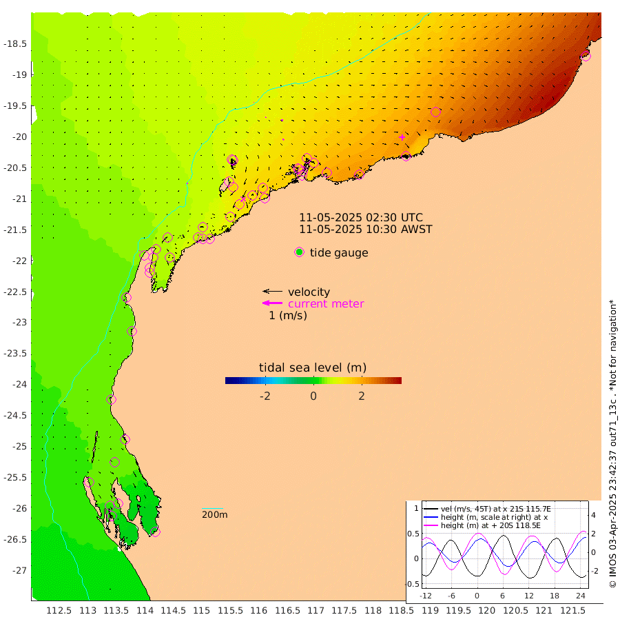 5cm/s -73T +12cm/s rms + 5cm/s -173T. NWSBAR 206m 2cm/s 36T +22cm/s rms + 10cm/s -148T. TAN100 109m 1cm/s -83T +11cm/s rms + 8cm/s -129T. PIL200 208m 3cm/s 49T +13cm/s rms + 7cm/s -137T. PIL100 105m 5cm/s 52T +12cm/s rms + 2cm/s -92T. PIL050 55m 2cm/s 36T +18cm/s rms + 4cm/s -149T. NRSNIN 61m 10cm/s 91T +6cm/s rms + 3cm/s 112T. NW Shelf M6 65m 38cm Withnell Point 35cm Denham 32cm Shark Bay (Inr Bn) 36cm Shark Bay 26cm Useless Loop -9cm Hamelin Pool 51cm Carnarvon 39cm Cape Cuvier 42cm Coral Bay 42cm Norwegian Bay 90cm Badjirrajirra 48cm Tantabiddi 70cm Point Murat 81cm Exmouth 92cm Learmonth 78cm Y Island 61cm North Muiron Island 72cm Roller 77cm Ashburton North 83cm Onslow (Beadon Creek) 80cm Thevenard Island 108cm Large Island 140cm North Sandy Island 109cm Barrow Island (Wapet Landing) 137cm Barrow Island (Tanker Mooring) 148cm Withnell Bay 99cm Trimouille Island 89cm North West Island 132cm Fortescue Road 137cm Steamboat Island 128cm Sholl Island 146cm Fairway Beacon 147cm Mawby Island 149cm Dampier (King Bay) 149cm Cape Legendre 156cm Hauy Island 183cm Port Walcott (Cape Lambert) 199cm Depuch Island 223cm Port Hedland 218cm Bedout Island 291cm Lagrange Bay