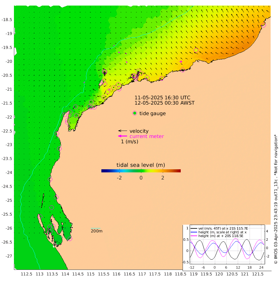 8cm/s -92T +12cm/s rms + 5cm/s -173T. NWSBAR 206m 4cm/s -141T +22cm/s rms + 10cm/s -148T. TAN100 109m 9cm/s -68T +11cm/s rms + 8cm/s -129T. PIL200 208m 16cm/s -47T +13cm/s rms + 7cm/s -137T. PIL100 105m 18cm/s -41T +12cm/s rms + 2cm/s -92T. PIL050 55m 4cm/s -128T +18cm/s rms + 4cm/s -149T. NRSNIN 61m 15cm/s -52T +6cm/s rms + 3cm/s 112T. NW Shelf M6 65m 3cm Withnell Point -3cm Denham -5cm Shark Bay (Inr Bn) -5cm Shark Bay -13cm Useless Loop -13cm Hamelin Pool 12cm Carnarvon 2cm Cape Cuvier 2cm Coral Bay 4cm Norwegian Bay 45cm Badjirrajirra 7cm Tantabiddi 27cm Point Murat 37cm Exmouth 51cm Learmonth 26cm Y Island 15cm North Muiron Island 21cm Roller 25cm Ashburton North 31cm Onslow (Beadon Creek) 26cm Thevenard Island 85cm Large Island 89cm North Sandy Island 51cm Barrow Island (Wapet Landing) 87cm Barrow Island (Tanker Mooring) 69cm Withnell Bay 62cm Trimouille Island 36cm North West Island 89cm Fortescue Road 72cm Steamboat Island 89cm Sholl Island 69cm Fairway Beacon 67cm Mawby Island 71cm Dampier (King Bay) 66cm Cape Legendre 91cm Hauy Island 98cm Port Walcott (Cape Lambert) 115cm Depuch Island 122cm Port Hedland 95cm Bedout Island 137cm Lagrange Bay