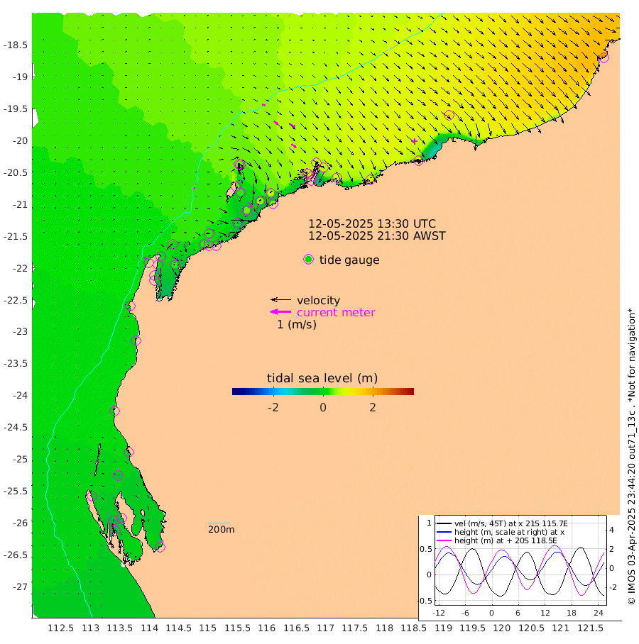 8cm/s 41T +12cm/s rms + 5cm/s -173T. NWSBAR 206m 7cm/s 47T +22cm/s rms + 10cm/s -148T. TAN100 109m 15cm/s 107T +11cm/s rms + 8cm/s -129T. PIL200 208m 24cm/s 126T +13cm/s rms + 7cm/s -137T. PIL100 105m 29cm/s 130T +12cm/s rms + 2cm/s -92T. PIL050 55m 7cm/s 47T +18cm/s rms + 4cm/s -149T. NRSNIN 61m 30cm/s 123T +6cm/s rms + 3cm/s 112T. NW Shelf M6 65m -19cm Withnell Point -37cm Denham -36cm Shark Bay (Inr Bn) -35cm Shark Bay -39cm Useless Loop -7cm Hamelin Pool -4cm Carnarvon 5cm Cape Cuvier 8cm Coral Bay 10cm Norwegian Bay 15cm Badjirrajirra 13cm Tantabiddi 12cm Point Murat 13cm Exmouth 19cm Learmonth 23cm Y Island 18cm North Muiron Island 26cm Roller 27cm Ashburton North 26cm Onslow (Beadon Creek) 28cm Thevenard Island 13cm Large Island 40cm North Sandy Island 37cm Barrow Island (Wapet Landing) 31cm Barrow Island (Tanker Mooring) 74cm Withnell Bay 30cm Trimouille Island 35cm North West Island 37cm Fortescue Road 65cm Steamboat Island 50cm Sholl Island 70cm Fairway Beacon 74cm Mawby Island 73cm Dampier (King Bay) 71cm Cape Legendre 75cm Hauy Island 88cm Port Walcott (Cape Lambert) 105cm Depuch Island 118cm Port Hedland 130cm Bedout Island 228cm Lagrange Bay
