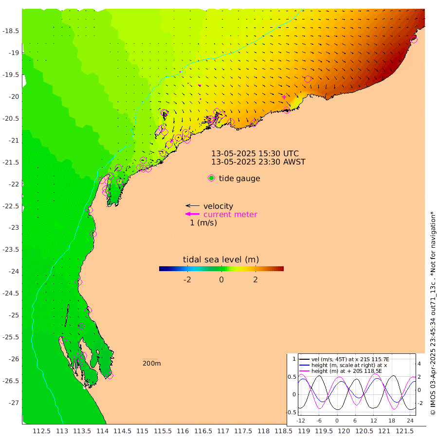 5cm/s -28T +12cm/s rms + 5cm/s -173T. NWSBAR 206m 4cm/s 49T +22cm/s rms + 10cm/s -148T. TAN100 109m 5cm/s 97T +11cm/s rms + 8cm/s -129T. PIL200 208m 8cm/s 108T +13cm/s rms + 7cm/s -137T. PIL100 105m 9cm/s 110T +12cm/s rms + 2cm/s -92T. PIL050 55m 4cm/s 43T +18cm/s rms + 4cm/s -149T. NRSNIN 61m 16cm/s 109T +6cm/s rms + 3cm/s 112T. NW Shelf M6 65m -6cm Withnell Point -25cm Denham -27cm Shark Bay (Inr Bn) -26cm Shark Bay -35cm Useless Loop -16cm Hamelin Pool 14cm Carnarvon 12cm Cape Cuvier 15cm Coral Bay 18cm Norwegian Bay 58cm Badjirrajirra 23cm Tantabiddi 39cm Point Murat 50cm Exmouth 65cm Learmonth 50cm Y Island 35cm North Muiron Island 48cm Roller 51cm Ashburton North 56cm Onslow (Beadon Creek) 53cm Thevenard Island 96cm Large Island 116cm North Sandy Island 82cm Barrow Island (Wapet Landing) 107cm Barrow Island (Tanker Mooring) 127cm Withnell Bay 79cm Trimouille Island 65cm North West Island 124cm Fortescue Road 122cm Steamboat Island 121cm Sholl Island 125cm Fairway Beacon 128cm Mawby Island 128cm Dampier (King Bay) 122cm Cape Legendre 145cm Hauy Island 164cm Port Walcott (Cape Lambert) 191cm Depuch Island 209cm Port Hedland 197cm Bedout Island 346cm Lagrange Bay