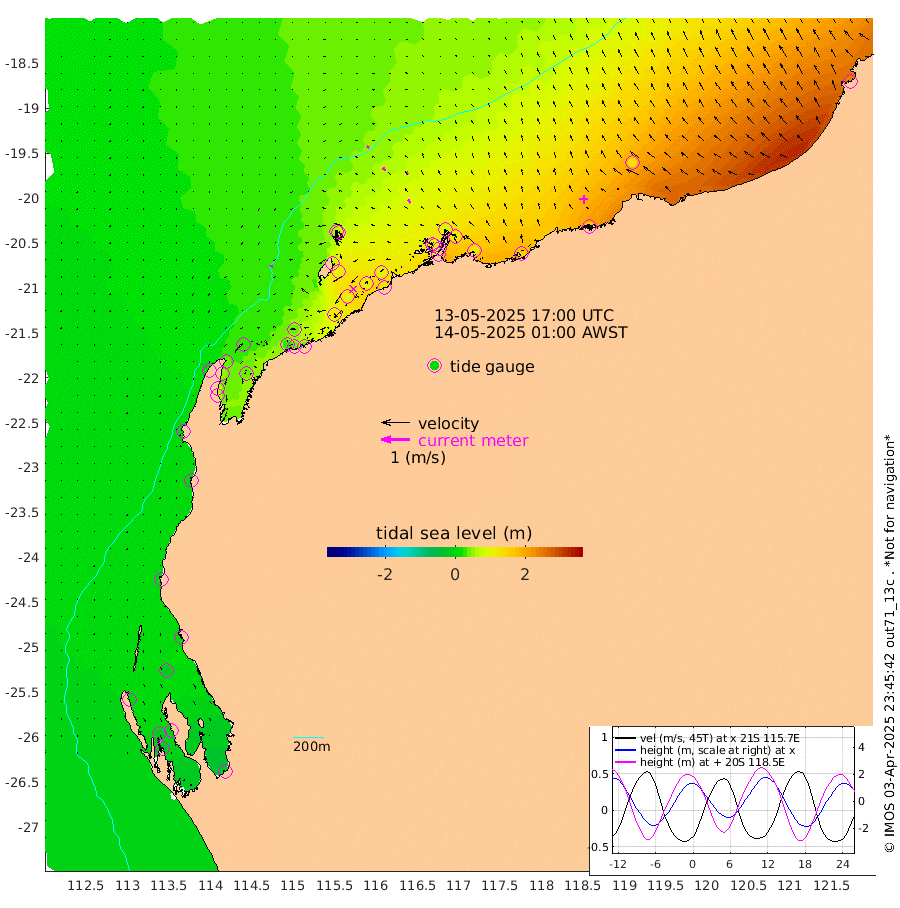 8cm/s -83T +12cm/s rms + 5cm/s -173T. NWSBAR 206m 2cm/s -143T +22cm/s rms + 10cm/s -148T. TAN100 109m 7cm/s -66T +11cm/s rms + 8cm/s -129T. PIL200 208m 13cm/s -43T +13cm/s rms + 7cm/s -137T. PIL100 105m 15cm/s -36T +12cm/s rms + 2cm/s -92T. PIL050 55m 2cm/s -121T +18cm/s rms + 4cm/s -149T. NRSNIN 61m 11cm/s -32T +6cm/s rms + 3cm/s 112T. NW Shelf M6 65m 2cm Withnell Point -9cm Denham -13cm Shark Bay (Inr Bn) -13cm Shark Bay -23cm Useless Loop -18cm Hamelin Pool 17cm Carnarvon 7cm Cape Cuvier 7cm Coral Bay 11cm Norwegian Bay 58cm Badjirrajirra 14cm Tantabiddi 36cm Point Murat 48cm Exmouth 64cm Learmonth 39cm Y Island 25cm North Muiron Island 33cm Roller 37cm Ashburton North 43cm Onslow (Beadon Creek) 38cm Thevenard Island 116cm Large Island 111cm North Sandy Island 68cm Barrow Island (Wapet Landing) 108cm Barrow Island (Tanker Mooring) 94cm Withnell Bay 72cm Trimouille Island 49cm North West Island 133cm Fortescue Road 97cm Steamboat Island 112cm Sholl Island 95cm Fairway Beacon 94cm Mawby Island 97cm Dampier (King Bay) 89cm Cape Legendre 120cm Hauy Island 130cm Port Walcott (Cape Lambert) 153cm Depuch Island 163cm Port Hedland 132cm Bedout Island 246cm Lagrange Bay