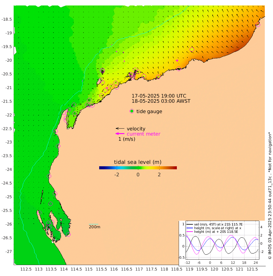 6cm/s -81T +12cm/s rms + 5cm/s -173T. NWSBAR 206m 1cm/s -139T +22cm/s rms + 10cm/s -148T. TAN100 109m 5cm/s -62T +11cm/s rms + 8cm/s -129T. PIL200 208m 10cm/s -44T +13cm/s rms + 7cm/s -137T. PIL100 105m 12cm/s -33T +12cm/s rms + 2cm/s -92T. PIL050 55m 0cm/s -96T +18cm/s rms + 4cm/s -149T. NRSNIN 61m 14cm/s -33T +6cm/s rms + 3cm/s 112T. NW Shelf M6 65m -1cm Withnell Point -15cm Denham -18cm Shark Bay (Inr Bn) -19cm Shark Bay -29cm Useless Loop -17cm Hamelin Pool 14cm Carnarvon 5cm Cape Cuvier 5cm Coral Bay 11cm Norwegian Bay 46cm Badjirrajirra 10cm Tantabiddi 28cm Point Murat 38cm Exmouth 49cm Learmonth 33cm Y Island 19cm North Muiron Island 26cm Roller 28cm Ashburton North 33cm Onslow (Beadon Creek) 29cm Thevenard Island 96cm Large Island 87cm North Sandy Island 52cm Barrow Island (Wapet Landing) 84cm Barrow Island (Tanker Mooring) 72cm Withnell Bay 53cm Trimouille Island 31cm North West Island 118cm Fortescue Road 68cm Steamboat Island 88cm Sholl Island 73cm Fairway Beacon 74cm Mawby Island 73cm Dampier (King Bay) 71cm Cape Legendre 91cm Hauy Island 98cm Port Walcott (Cape Lambert) 114cm Depuch Island 123cm Port Hedland 95cm Bedout Island 209cm Lagrange Bay