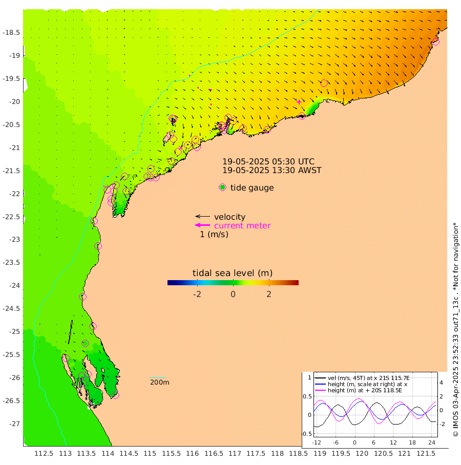 3cm/s 38T +12cm/s rms + 5cm/s -173T. NWSBAR 206m 4cm/s 38T +22cm/s rms + 10cm/s -148T. TAN100 109m 7cm/s 107T +11cm/s rms + 8cm/s -129T. PIL200 208m 9cm/s 117T +13cm/s rms + 7cm/s -137T. PIL100 105m 10cm/s 121T +12cm/s rms + 2cm/s -92T. PIL050 55m 3cm/s 39T +18cm/s rms + 4cm/s -149T. NRSNIN 61m 19cm/s 106T +6cm/s rms + 3cm/s 112T. NW Shelf M6 65m 34cm Withnell Point 28cm Denham 26cm Shark Bay (Inr Bn) 33cm Shark Bay 24cm Useless Loop -6cm Hamelin Pool 46cm Carnarvon 42cm Cape Cuvier 45cm Coral Bay 44cm Norwegian Bay 72cm Badjirrajirra 49cm Tantabiddi 60cm Point Murat 66cm Exmouth 66cm Learmonth 69cm Y Island 57cm North Muiron Island 65cm Roller 65cm Ashburton North 70cm Onslow (Beadon Creek) 68cm Thevenard Island 80cm Large Island 94cm North Sandy Island 83cm Barrow Island (Wapet Landing) 95cm Barrow Island (Tanker Mooring) 110cm Withnell Bay 72cm Trimouille Island 76cm North West Island 85cm Fortescue Road 118cm Steamboat Island 97cm Sholl Island 108cm Fairway Beacon 112cm Mawby Island 110cm Dampier (King Bay) 110cm Cape Legendre 113cm Hauy Island 128cm Port Walcott (Cape Lambert) 133cm Depuch Island 153cm Port Hedland 159cm Bedout Island 218cm Lagrange Bay