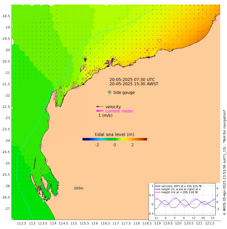 2cm/s -7T +12cm/s rms + 5cm/s -173T. NWSBAR 206m 1cm/s -140T +22cm/s rms + 10cm/s -148T. TAN100 109m 2cm/s 88T +11cm/s rms + 8cm/s -129T. PIL200 208m 2cm/s 16T +13cm/s rms + 7cm/s -137T. PIL100 105m 2cm/s 15T +12cm/s rms + 2cm/s -92T. PIL050 55m 1cm/s -120T +18cm/s rms + 4cm/s -149T. NRSNIN 61m 7cm/s 13T +6cm/s rms + 3cm/s 112T. NW Shelf M6 65m 25cm Withnell Point 25cm Denham 23cm Shark Bay (Inr Bn) 28cm Shark Bay 21cm Useless Loop -5cm Hamelin Pool 35cm Carnarvon 26cm Cape Cuvier 28cm Coral Bay 30cm Norwegian Bay 61cm Badjirrajirra 32cm Tantabiddi 46cm Point Murat 54cm Exmouth 55cm Learmonth 54cm Y Island 41cm North Muiron Island 46cm Roller 47cm Ashburton North 52cm Onslow (Beadon Creek) 50cm Thevenard Island 80cm Large Island 79cm North Sandy Island 66cm Barrow Island (Wapet Landing) 82cm Barrow Island (Tanker Mooring) 85cm Withnell Bay 53cm Trimouille Island 56cm North West Island 88cm Fortescue Road 90cm Steamboat Island 86cm Sholl Island 84cm Fairway Beacon 87cm Mawby Island 85cm Dampier (King Bay) 86cm Cape Legendre 94cm Hauy Island 102cm Port Walcott (Cape Lambert) 104cm Depuch Island 122cm Port Hedland 118cm Bedout Island 160cm Lagrange Bay