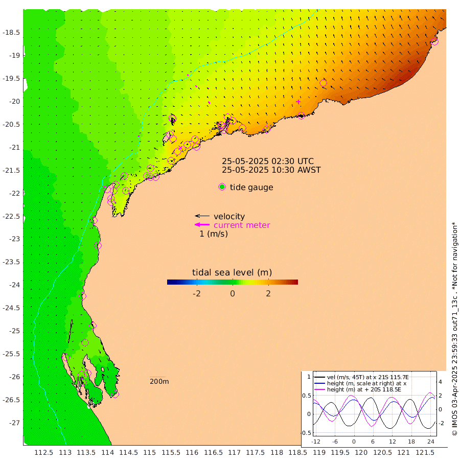 8cm/s -93T +12cm/s rms + 5cm/s -173T. NWSBAR 206m 3cm/s -133T +22cm/s rms + 10cm/s -148T. TAN100 109m 9cm/s -74T +11cm/s rms + 8cm/s -129T. PIL200 208m 14cm/s -43T +13cm/s rms + 7cm/s -137T. PIL100 105m 16cm/s -34T +12cm/s rms + 2cm/s -92T. PIL050 55m 4cm/s -126T +18cm/s rms + 4cm/s -149T. NRSNIN 61m 8cm/s -12T +6cm/s rms + 3cm/s 112T. NW Shelf M6 65m 36cm Withnell Point 44cm Denham 41cm Shark Bay (Inr Bn) 44cm Shark Bay 38cm Useless Loop -3cm Hamelin Pool 41cm Carnarvon 22cm Cape Cuvier 23cm Coral Bay 25cm Norwegian Bay 77cm Badjirrajirra 31cm Tantabiddi 56cm Point Murat 69cm Exmouth 74cm Learmonth 63cm Y Island 44cm North Muiron Island 54cm Roller 56cm Ashburton North 64cm Onslow (Beadon Creek) 59cm Thevenard Island 92cm Large Island 124cm North Sandy Island 88cm Barrow Island (Wapet Landing) 126cm Barrow Island (Tanker Mooring) 117cm Withnell Bay 85cm Trimouille Island 67cm North West Island 113cm Fortescue Road 118cm Steamboat Island 107cm Sholl Island 116cm Fairway Beacon 113cm Mawby Island 117cm Dampier (King Bay) 117cm Cape Legendre 135cm Hauy Island 150cm Port Walcott (Cape Lambert) 178cm Depuch Island 183cm Port Hedland 176cm Bedout Island 227cm Lagrange Bay