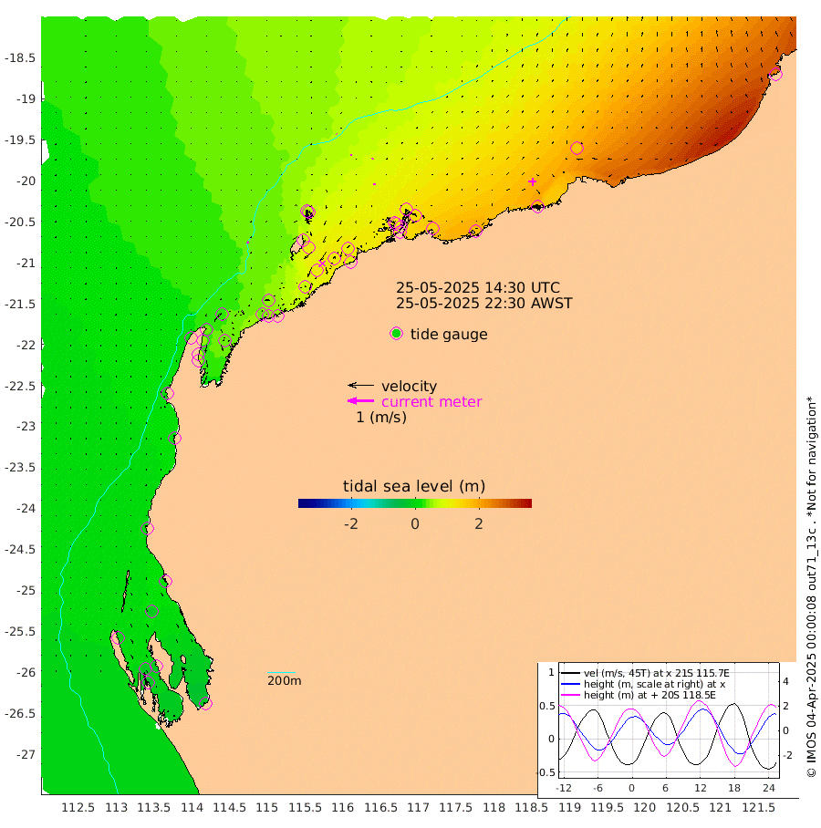 7cm/s -65T +12cm/s rms + 5cm/s -173T. NWSBAR 206m 0cm/s 99T +22cm/s rms + 10cm/s -148T. TAN100 109m 2cm/s -41T +11cm/s rms + 8cm/s -129T. PIL200 208m 4cm/s -17T +13cm/s rms + 7cm/s -137T. PIL100 105m 5cm/s -8T +12cm/s rms + 2cm/s -92T. PIL050 55m 0cm/s -16T +18cm/s rms + 4cm/s -149T. NRSNIN 61m 3cm/s 47T +6cm/s rms + 3cm/s 112T. NW Shelf M6 65m 3cm Withnell Point -13cm Denham -16cm Shark Bay (Inr Bn) -14cm Shark Bay -27cm Useless Loop -19cm Hamelin Pool 20cm Carnarvon 12cm Cape Cuvier 12cm Coral Bay 16cm Norwegian Bay 60cm Badjirrajirra 20cm Tantabiddi 40cm Point Murat 51cm Exmouth 67cm Learmonth 45cm Y Island 30cm North Muiron Island 43cm Roller 45cm Ashburton North 51cm Onslow (Beadon Creek) 48cm Thevenard Island 76cm Large Island 115cm North Sandy Island 77cm Barrow Island (Wapet Landing) 109cm Barrow Island (Tanker Mooring) 114cm Withnell Bay 76cm Trimouille Island 59cm North West Island 95cm Fortescue Road 109cm Steamboat Island 114cm Sholl Island 112cm Fairway Beacon 115cm Mawby Island 115cm Dampier (King Bay) 116cm Cape Legendre 136cm Hauy Island 149cm Port Walcott (Cape Lambert) 173cm Depuch Island 187cm Port Hedland 163cm Bedout Island 241cm Lagrange Bay