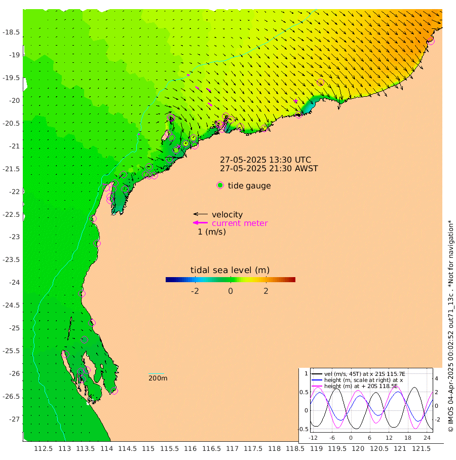9cm/s 41T +12cm/s rms + 5cm/s -173T. NWSBAR 206m 8cm/s 48T +22cm/s rms + 10cm/s -148T. TAN100 109m 18cm/s 108T +11cm/s rms + 8cm/s -129T. PIL200 208m 29cm/s 126T +13cm/s rms + 7cm/s -137T. PIL100 105m 34cm/s 129T +12cm/s rms + 2cm/s -92T. PIL050 55m 9cm/s 49T +18cm/s rms + 4cm/s -149T. NRSNIN 61m 35cm/s 129T +6cm/s rms + 3cm/s 112T. NW Shelf M6 65m -30cm Withnell Point -54cm Denham -52cm Shark Bay (Inr Bn) -52cm Shark Bay -56cm Useless Loop -8cm Hamelin Pool -11cm Carnarvon 3cm Cape Cuvier 6cm Coral Bay 8cm Norwegian Bay 14cm Badjirrajirra 11cm Tantabiddi 10cm Point Murat 11cm Exmouth 19cm Learmonth 19cm Y Island 14cm North Muiron Island 23cm Roller 27cm Ashburton North 27cm Onslow (Beadon Creek) 28cm Thevenard Island 2cm Large Island 41cm North Sandy Island 40cm Barrow Island (Wapet Landing) 32cm Barrow Island (Tanker Mooring) 81cm Withnell Bay 40cm Trimouille Island 31cm North West Island 25cm Fortescue Road 65cm Steamboat Island 63cm Sholl Island 77cm Fairway Beacon 81cm Mawby Island 81cm Dampier (King Bay) 85cm Cape Legendre 81cm Hauy Island 99cm Port Walcott (Cape Lambert) 100cm Depuch Island 133cm Port Hedland 151cm Bedout Island 216cm Lagrange Bay