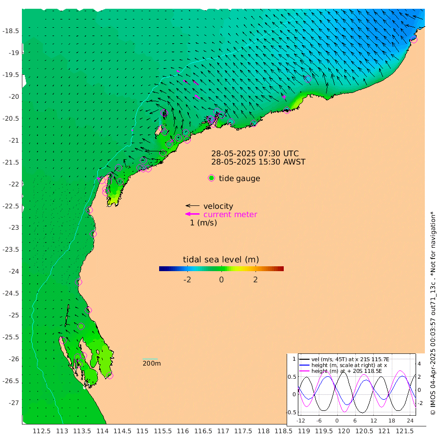 9cm/s -136T +12cm/s rms + 5cm/s -173T. NWSBAR 206m 15cm/s -137T +22cm/s rms + 10cm/s -148T. TAN100 109m 21cm/s -74T +11cm/s rms + 8cm/s -129T. PIL200 208m 36cm/s -56T +13cm/s rms + 7cm/s -137T. PIL100 105m 44cm/s -53T +12cm/s rms + 2cm/s -92T. PIL050 55m 16cm/s -133T +18cm/s rms + 4cm/s -149T. NRSNIN 61m 46cm/s -53T +6cm/s rms + 3cm/s 112T. NW Shelf M6 65m -11cm Withnell Point 26cm Denham 28cm Shark Bay (Inr Bn) 23cm Shark Bay 40cm Useless Loop 25cm Hamelin Pool -39cm Carnarvon -51cm Cape Cuvier -54cm Coral Bay -55cm Norwegian Bay -50cm Badjirrajirra -56cm Tantabiddi -50cm Point Murat -48cm Exmouth -54cm Learmonth -57cm Y Island -57cm North Muiron Island -65cm Roller -68cm Ashburton North -66cm Onslow (Beadon Creek) -70cm Thevenard Island -24cm Large Island -70cm North Sandy Island -74cm Barrow Island (Wapet Landing) -58cm Barrow Island (Tanker Mooring) -111cm Withnell Bay -74cm Trimouille Island -69cm North West Island -34cm Fortescue Road -97cm Steamboat Island -76cm Sholl Island -107cm Fairway Beacon -112cm Mawby Island -111cm Dampier (King Bay) -120cm Cape Legendre -98cm Hauy Island -121cm Port Walcott (Cape Lambert) -120cm Depuch Island -146cm Port Hedland -155cm Bedout Island -224cm Lagrange Bay