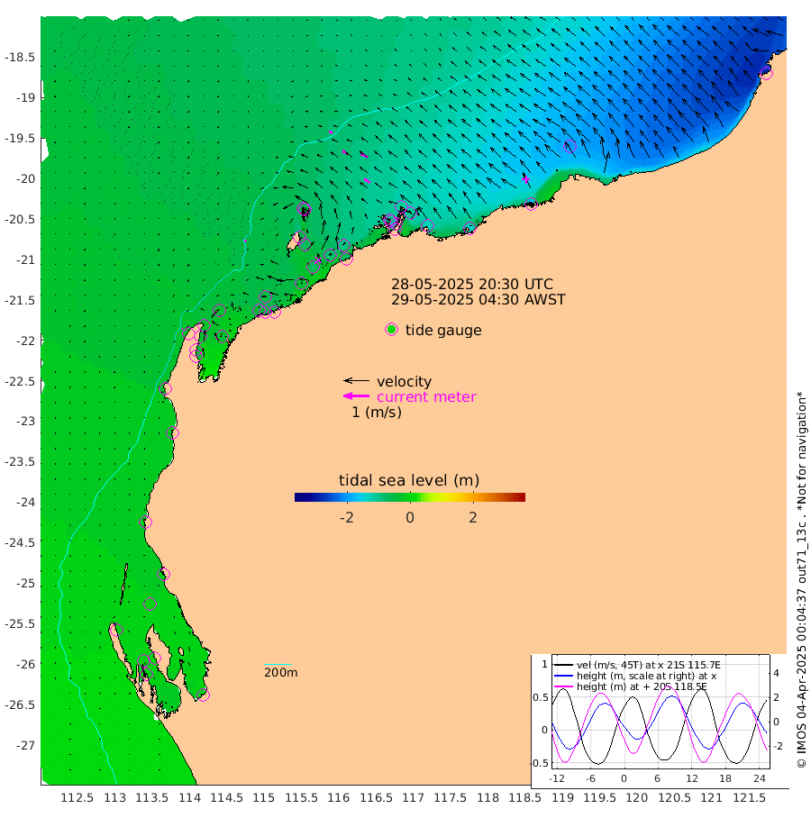 7cm/s -149T +12cm/s rms + 5cm/s -173T. NWSBAR 206m 3cm/s -133T +22cm/s rms + 10cm/s -148T. TAN100 109m 13cm/s -72T +11cm/s rms + 8cm/s -129T. PIL200 208m 21cm/s -58T +13cm/s rms + 7cm/s -137T. PIL100 105m 26cm/s -56T +12cm/s rms + 2cm/s -92T. PIL050 55m 3cm/s -127T +18cm/s rms + 4cm/s -149T. NRSNIN 61m 31cm/s -62T +6cm/s rms + 3cm/s 112T. NW Shelf M6 65m 0cm Withnell Point 2cm Denham -1cm Shark Bay (Inr Bn) -1cm Shark Bay -5cm Useless Loop -9cm Hamelin Pool -9cm Carnarvon -12cm Cape Cuvier -17cm Coral Bay -18cm Norwegian Bay -44cm Badjirrajirra -24cm Tantabiddi -32cm Point Murat -38cm Exmouth -45cm Learmonth -45cm Y Island -33cm North Muiron Island -42cm Roller -46cm Ashburton North -49cm Onslow (Beadon Creek) -48cm Thevenard Island -44cm Large Island -70cm North Sandy Island -67cm Barrow Island (Wapet Landing) -69cm Barrow Island (Tanker Mooring) -109cm Withnell Bay -57cm Trimouille Island -58cm North West Island -70cm Fortescue Road -99cm Steamboat Island -83cm Sholl Island -105cm Fairway Beacon -108cm Mawby Island -109cm Dampier (King Bay) -110cm Cape Legendre -110cm Hauy Island -134cm Port Walcott (Cape Lambert) -138cm Depuch Island -173cm Port Hedland -195cm Bedout Island -284cm Lagrange Bay