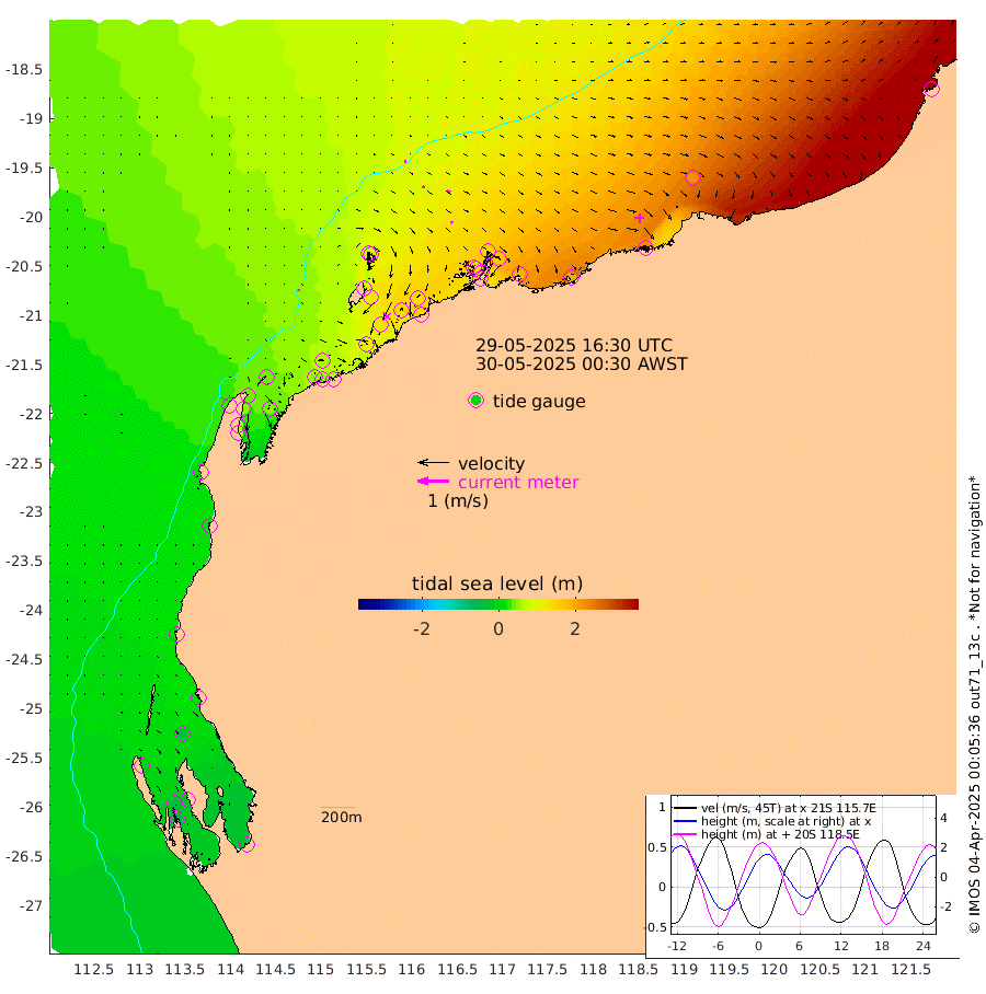 5cm/s -26T +12cm/s rms + 5cm/s -173T. NWSBAR 206m 4cm/s 50T +22cm/s rms + 10cm/s -148T. TAN100 109m 5cm/s 99T +11cm/s rms + 8cm/s -129T. PIL200 208m 7cm/s 103T +13cm/s rms + 7cm/s -137T. PIL100 105m 9cm/s 102T +12cm/s rms + 2cm/s -92T. PIL050 55m 4cm/s 45T +18cm/s rms + 4cm/s -149T. NRSNIN 61m 11cm/s 109T +6cm/s rms + 3cm/s 112T. NW Shelf M6 65m -10cm Withnell Point -34cm Denham -35cm Shark Bay (Inr Bn) -35cm Shark Bay -46cm Useless Loop -18cm Hamelin Pool 15cm Carnarvon 13cm Cape Cuvier 15cm Coral Bay 21cm Norwegian Bay 68cm Badjirrajirra 24cm Tantabiddi 44cm Point Murat 56cm Exmouth 73cm Learmonth 54cm Y Island 36cm North Muiron Island 48cm Roller 55cm Ashburton North 62cm Onslow (Beadon Creek) 57cm Thevenard Island 111cm Large Island 128cm North Sandy Island 91cm Barrow Island (Wapet Landing) 122cm Barrow Island (Tanker Mooring) 139cm Withnell Bay 97cm Trimouille Island 64cm North West Island 140cm Fortescue Road 132cm Steamboat Island 141cm Sholl Island 137cm Fairway Beacon 138cm Mawby Island 141cm Dampier (King Bay) 142cm Cape Legendre 159cm Hauy Island 181cm Port Walcott (Cape Lambert) 198cm Depuch Island 231cm Port Hedland 219cm Bedout Island 350cm Lagrange Bay