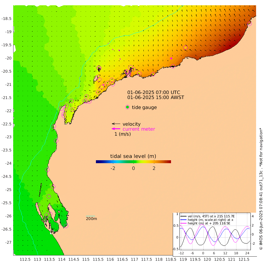 4cm/s -75T +12cm/s rms + 5cm/s -173T. NWSBAR 206m 4cm/s -139T +22cm/s rms + 10cm/s -148T. TAN100 109m 4cm/s -64T +11cm/s rms + 8cm/s -129T. PIL200 208m 11cm/s -39T +13cm/s rms + 7cm/s -137T. PIL100 105m 13cm/s -29T +12cm/s rms + 2cm/s -92T. PIL050 55m 4cm/s -131T +18cm/s rms + 4cm/s -149T. NRSNIN 61m 20cm/s -34T +6cm/s rms + 3cm/s 112T. NW Shelf M6 65m 36cm Withnell Point 40cm Denham 39cm Shark Bay (Inr Bn) 42cm Shark Bay 35cm Useless Loop -5cm Hamelin Pool 44cm Carnarvon 28cm Cape Cuvier 30cm Coral Bay 32cm Norwegian Bay 87cm Badjirrajirra 36cm Tantabiddi 62cm Point Murat 76cm Exmouth 86cm Learmonth 69cm Y Island 49cm North Muiron Island 56cm Roller 62cm Ashburton North 70cm Onslow (Beadon Creek) 65cm Thevenard Island 132cm Large Island 127cm North Sandy Island 95cm Barrow Island (Wapet Landing) 130cm Barrow Island (Tanker Mooring) 120cm Withnell Bay 85cm Trimouille Island 74cm North West Island 145cm Fortescue Road 114cm Steamboat Island 131cm Sholl Island 119cm Fairway Beacon 121cm Mawby Island 122cm Dampier (King Bay) 121cm Cape Legendre 136cm Hauy Island 153cm Port Walcott (Cape Lambert) 152cm Depuch Island 185cm Port Hedland 171cm Bedout Island 214cm Lagrange Bay