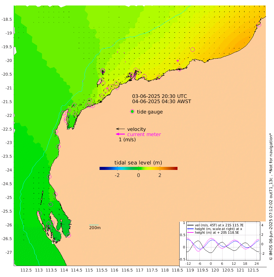 2cm/s -48T +12cm/s rms + 5cm/s -173T. NWSBAR 206m 2cm/s 42T +22cm/s rms + 10cm/s -148T. TAN100 109m 1cm/s 79T +11cm/s rms + 8cm/s -129T. PIL200 208m 3cm/s 87T +13cm/s rms + 7cm/s -137T. PIL100 105m 5cm/s 81T +12cm/s rms + 2cm/s -92T. PIL050 55m 3cm/s 46T +18cm/s rms + 4cm/s -149T. NRSNIN 61m 6cm/s -8T +6cm/s rms + 3cm/s 112T. NW Shelf M6 65m 13cm Withnell Point 1cm Denham -1cm Shark Bay (Inr Bn) -2cm Shark Bay -8cm Useless Loop -13cm Hamelin Pool 28cm Carnarvon 22cm Cape Cuvier 24cm Coral Bay 29cm Norwegian Bay 50cm Badjirrajirra 26cm Tantabiddi 37cm Point Murat 43cm Exmouth 50cm Learmonth 42cm Y Island 33cm North Muiron Island 35cm Roller 41cm Ashburton North 44cm Onslow (Beadon Creek) 42cm Thevenard Island 68cm Large Island 69cm North Sandy Island 56cm Barrow Island (Wapet Landing) 68cm Barrow Island (Tanker Mooring) 75cm Withnell Bay 53cm Trimouille Island 41cm North West Island 84cm Fortescue Road 68cm Steamboat Island 75cm Sholl Island 74cm Fairway Beacon 74cm Mawby Island 75cm Dampier (King Bay) 79cm Cape Legendre 78cm Hauy Island 91cm Port Walcott (Cape Lambert) 92cm Depuch Island 110cm Port Hedland 94cm Bedout Island 132cm Lagrange Bay