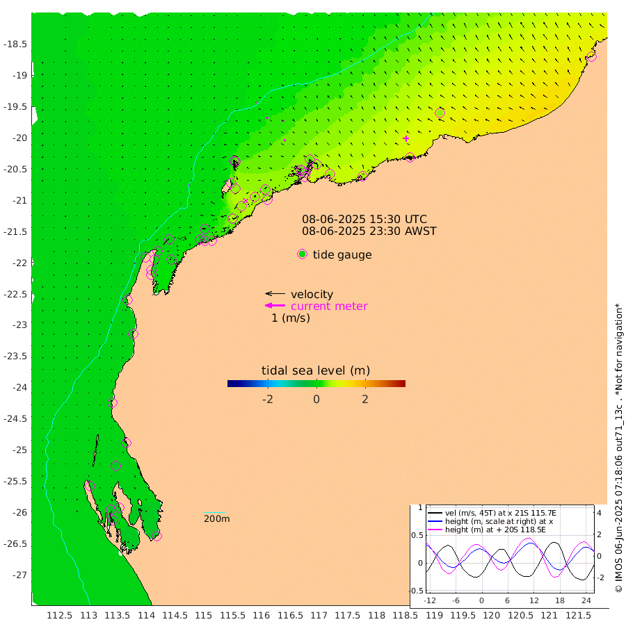 6cm/s -91T +12cm/s rms + 5cm/s -173T. NWSBAR 206m 2cm/s -146T +22cm/s rms + 10cm/s -148T. TAN100 109m 6cm/s -70T +11cm/s rms + 8cm/s -129T. PIL200 208m 10cm/s -47T +13cm/s rms + 7cm/s -137T. PIL100 105m 11cm/s -42T +12cm/s rms + 2cm/s -92T. PIL050 55m 2cm/s -122T +18cm/s rms + 4cm/s -149T. NRSNIN 61m 7cm/s -60T +6cm/s rms + 3cm/s 112T. NW Shelf M6 65m -4cm Withnell Point -13cm Denham -14cm Shark Bay (Inr Bn) -15cm Shark Bay -21cm Useless Loop -12cm Hamelin Pool 2cm Carnarvon -2cm Cape Cuvier -3cm Coral Bay -2cm Norwegian Bay 20cm Badjirrajirra 0cm Tantabiddi 11cm Point Murat 16cm Exmouth 28cm Learmonth 8cm Y Island 4cm North Muiron Island 7cm Roller 10cm Ashburton North 13cm Onslow (Beadon Creek) 11cm Thevenard Island 60cm Large Island 50cm North Sandy Island 26cm Barrow Island (Wapet Landing) 48cm Barrow Island (Tanker Mooring) 36cm Withnell Bay 36cm Trimouille Island 18cm North West Island 63cm Fortescue Road 38cm Steamboat Island 47cm Sholl Island 37cm Fairway Beacon 35cm Mawby Island 38cm Dampier (King Bay) 36cm Cape Legendre 53cm Hauy Island 55cm Port Walcott (Cape Lambert) 67cm Depuch Island 69cm Port Hedland 48cm Bedout Island 110cm Lagrange Bay