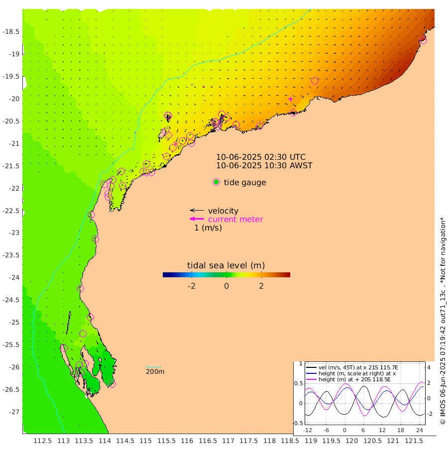 4cm/s -77T +12cm/s rms + 5cm/s -173T. NWSBAR 206m 1cm/s 21T +22cm/s rms + 10cm/s -148T. TAN100 109m 1cm/s -76T +11cm/s rms + 8cm/s -129T. PIL200 208m 3cm/s 11T +13cm/s rms + 7cm/s -137T. PIL100 105m 5cm/s 30T +12cm/s rms + 2cm/s -92T. PIL050 55m 1cm/s 25T +18cm/s rms + 4cm/s -149T. NRSNIN 61m 10cm/s 94T +6cm/s rms + 3cm/s 112T. NW Shelf M6 65m 44cm Withnell Point 46cm Denham 44cm Shark Bay (Inr Bn) 50cm Shark Bay 42cm Useless Loop -4cm Hamelin Pool 52cm Carnarvon 39cm Cape Cuvier 42cm Coral Bay 42cm Norwegian Bay 86cm Badjirrajirra 48cm Tantabiddi 67cm Point Murat 78cm Exmouth 85cm Learmonth 76cm Y Island 60cm North Muiron Island 70cm Roller 73cm Ashburton North 78cm Onslow (Beadon Creek) 76cm Thevenard Island 120cm Large Island 128cm North Sandy Island 100cm Barrow Island (Wapet Landing) 127cm Barrow Island (Tanker Mooring) 131cm Withnell Bay 93cm Trimouille Island 81cm North West Island 142cm Fortescue Road 119cm Steamboat Island 110cm Sholl Island 130cm Fairway Beacon 129cm Mawby Island 132cm Dampier (King Bay) 130cm Cape Legendre 138cm Hauy Island 161cm Port Walcott (Cape Lambert) 176cm Depuch Island 194cm Port Hedland 194cm Bedout Island 321cm Lagrange Bay