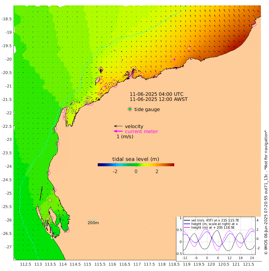 6cm/s -94T +12cm/s rms + 5cm/s -173T. NWSBAR 206m 4cm/s -133T +22cm/s rms + 10cm/s -148T. TAN100 109m 7cm/s -74T +11cm/s rms + 8cm/s -129T. PIL200 208m 14cm/s -42T +13cm/s rms + 7cm/s -137T. PIL100 105m 15cm/s -32T +12cm/s rms + 2cm/s -92T. PIL050 55m 4cm/s -128T +18cm/s rms + 4cm/s -149T. NRSNIN 61m 10cm/s -20T +6cm/s rms + 3cm/s 112T. NW Shelf M6 65m 39cm Withnell Point 50cm Denham 48cm Shark Bay (Inr Bn) 52cm Shark Bay 48cm Useless Loop 1cm Hamelin Pool 41cm Carnarvon 23cm Cape Cuvier 27cm Coral Bay 26cm Norwegian Bay 79cm Badjirrajirra 33cm Tantabiddi 58cm Point Murat 71cm Exmouth 79cm Learmonth 65cm Y Island 46cm North Muiron Island 55cm Roller 58cm Ashburton North 65cm Onslow (Beadon Creek) 61cm Thevenard Island 140cm Large Island 125cm North Sandy Island 89cm Barrow Island (Wapet Landing) 127cm Barrow Island (Tanker Mooring) 114cm Withnell Bay 84cm Trimouille Island 69cm North West Island 160cm Fortescue Road 106cm Steamboat Island 109cm Sholl Island 114cm Fairway Beacon 112cm Mawby Island 116cm Dampier (King Bay) 109cm Cape Legendre 129cm Hauy Island 148cm Port Walcott (Cape Lambert) 164cm Depuch Island 180cm Port Hedland 175cm Bedout Island 300cm Lagrange Bay